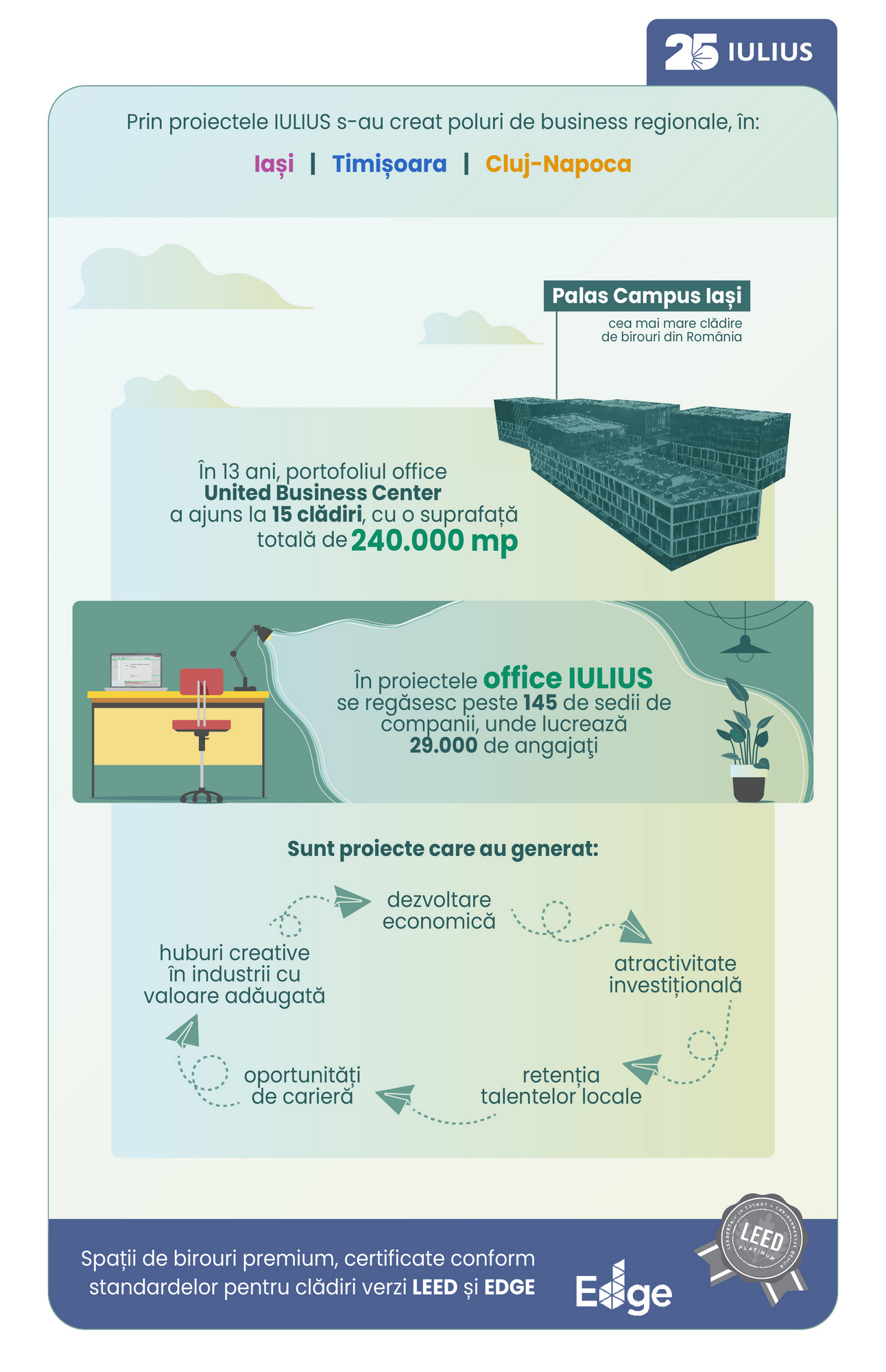 Compania IULIUS s-a impus drept unul dintre cei mai activi dezvoltatori și operatori de spații office clasa A, construind, sub brandul național United Business Center, poluri regionale de business și comunități creative multinaționale în trei centre universitare importante ale României – Iași, Timișoara și Cluj-Napoca. În total, 15 clădiri verzi, cu o suprafață totală de peste 240.000 mp, în care sunt prezente 145 sedii de companii și unde lucrează peste 29.000 de angajați.