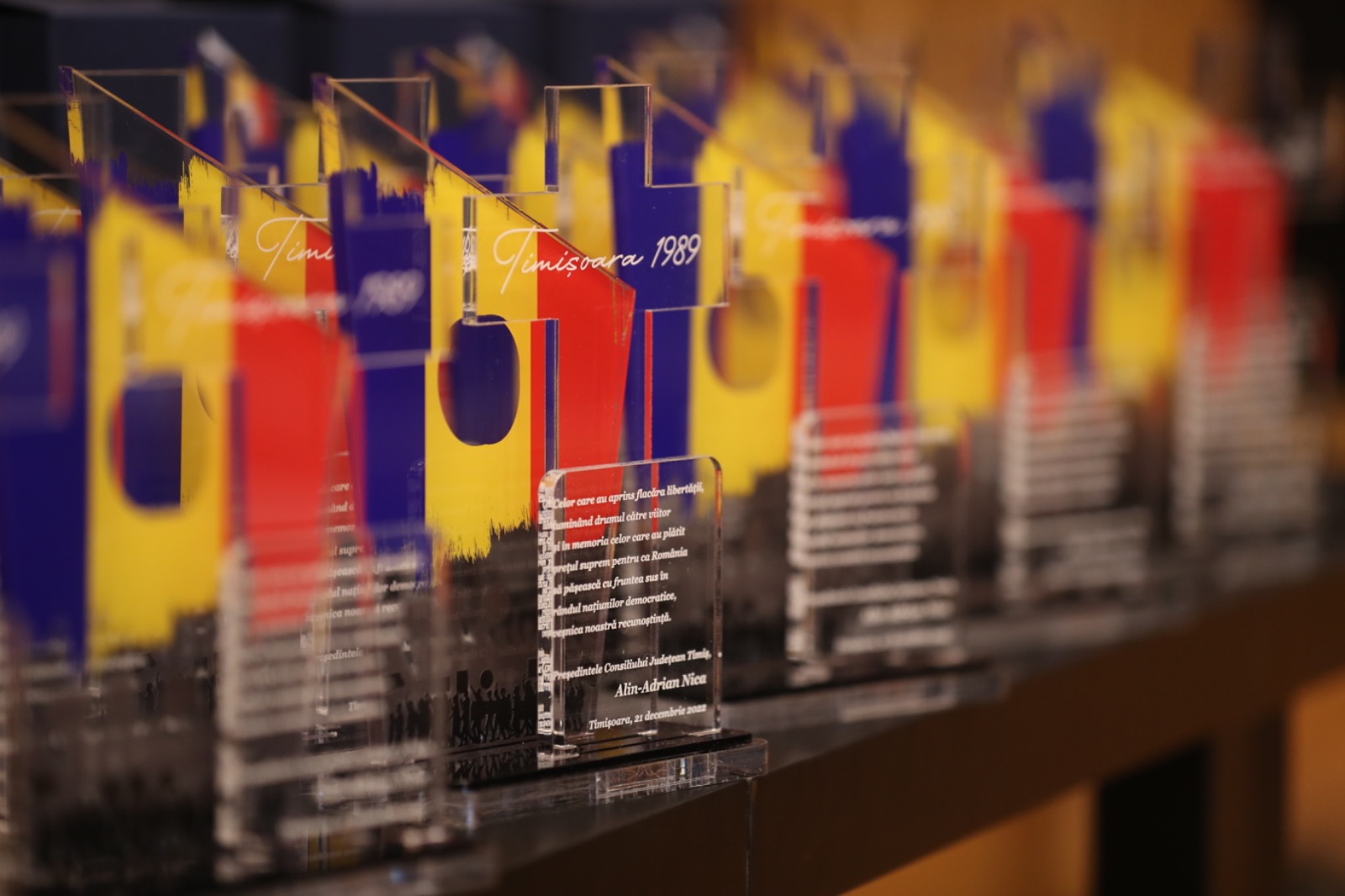Dănuț Ardelean, secretarul județului Timiș, a citit lista asociațiilor de revoluționari, liderii lor primind însemnele simbolice ale CJT pentru curajul din acele zile care a dus la sfârșitul tiraniei.