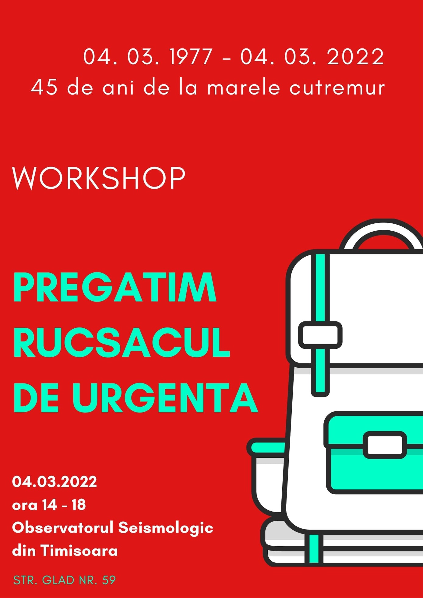 Vă invităm la workshopul de acordare a primului ajutor în caz de urgență susținut de echipa ATI de la Universitatea de Medicină și Farmacie Victor Babeș Timișoara. Echipăm rucsacul de urgență și învățăm să ne adăpostim corespunzător în caz de cutremur cu Vanciu Rău Adina de la Institutul Național de Cercetare-Dezvoltare pentru Fizica Pământului”, transmit reprezentanții proiectul Seismo Lab.
