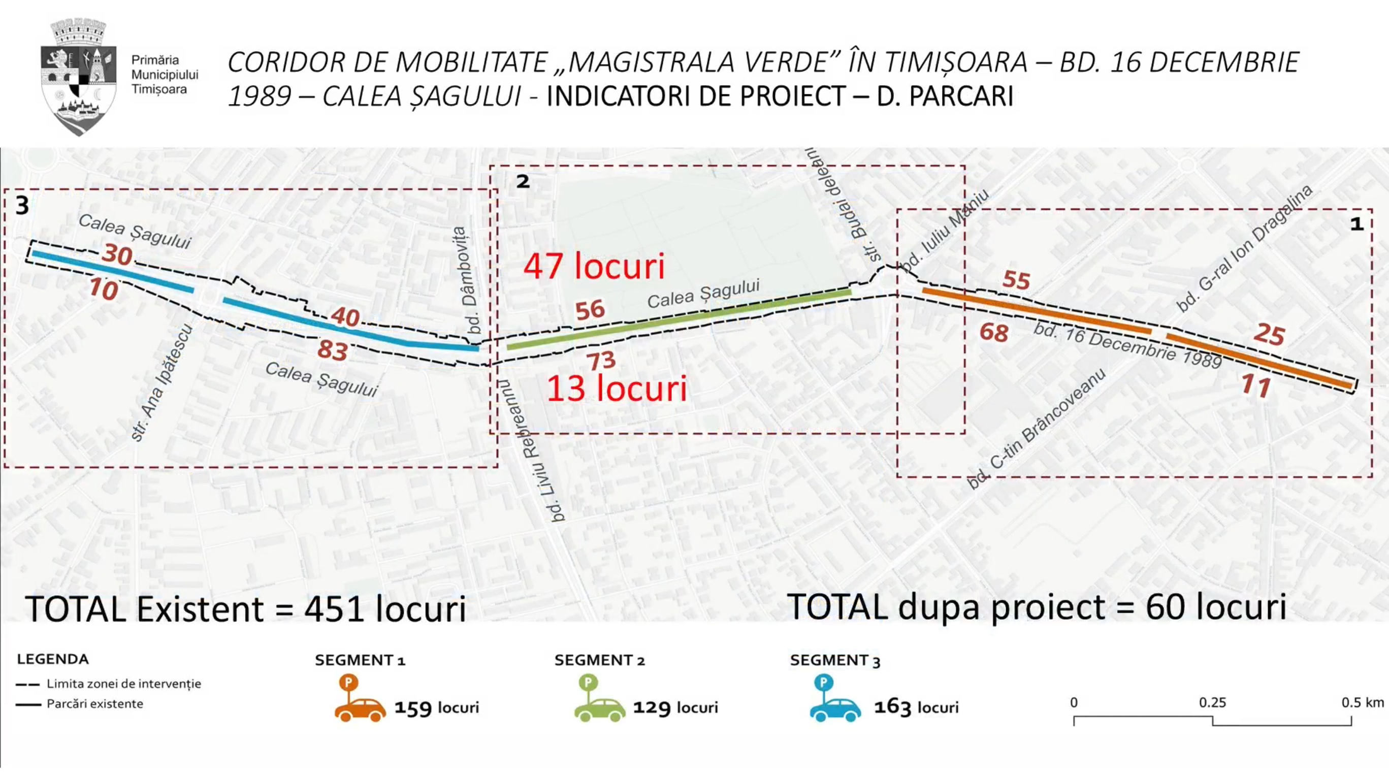 În cadrul prezentării, reprezentantul proiectantului a vorbit destul de detaliat de locuri de parcare care vor fi reamenajate de-a lungul magistralei. „Aici o să fie un pic mai dureros în sensul în care o să dispară un număr rezonabil de locuri de parcare”, a spus acesta, prezentând de unde vor fi tăiate peste 85% dintre locurile de parcare existente de-a lungul bulevardului.