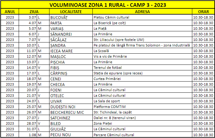 Cetățenii din localităţile menţionate mai sus pot depune prin aport voluntar și gratuit deșeurile voluminoase în containerele special puse la dispoziție în punctele de colectare și între orele menționate în tabelul de mai jos.