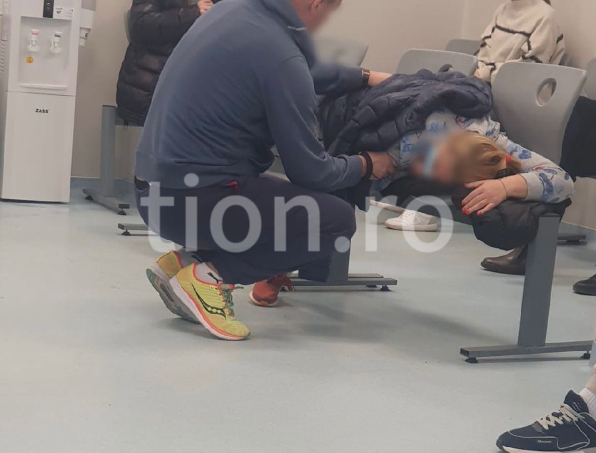 O altă imagine arată cum o pacientă stă întinsă pe scaunele din sala de așteptare, iar pe chip i se citește durerea.