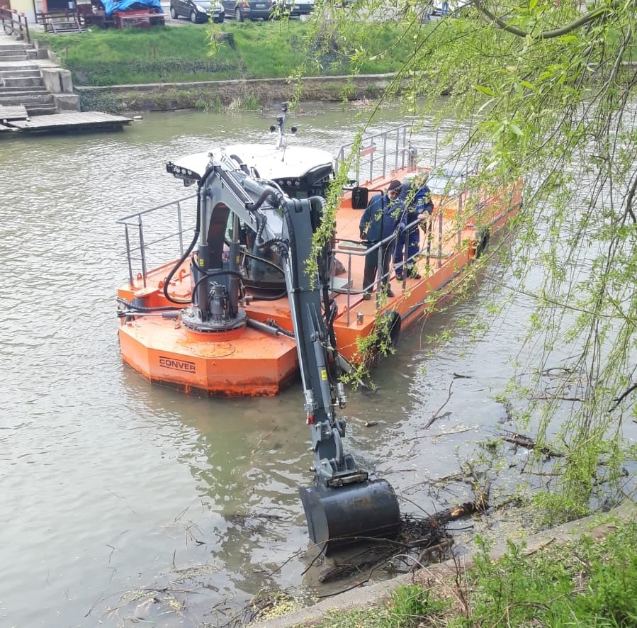 În Timișoara, aval de podul Dragalina de pe Canalul Bega, cei de la Sistemul Hidrotehnic Bega din cadrul SGA Timiș au folosit draga pentru a înlătura mai multe obstacole lemnoase din albie.