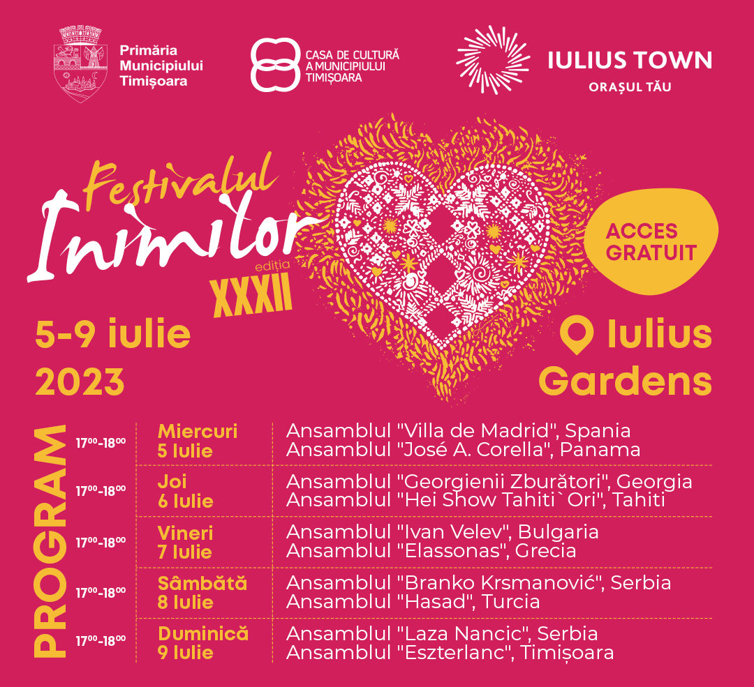 „Festivalul Inimilor” a ajuns la cea de-a 32-a ediție și, ca în fiecare an, folclorul mondial este sărbătorit în Banat alături de mai multe ansambluri venite din toate colțurile lumii. Astfel, în perioada 5 – 9 iulie, artiști din 13 țări, de pe patru continente, vor susține spectacole în mai multe locații din Timișoara, punând în valoare tradițiile și obiceiurile țărilor de unde vin.