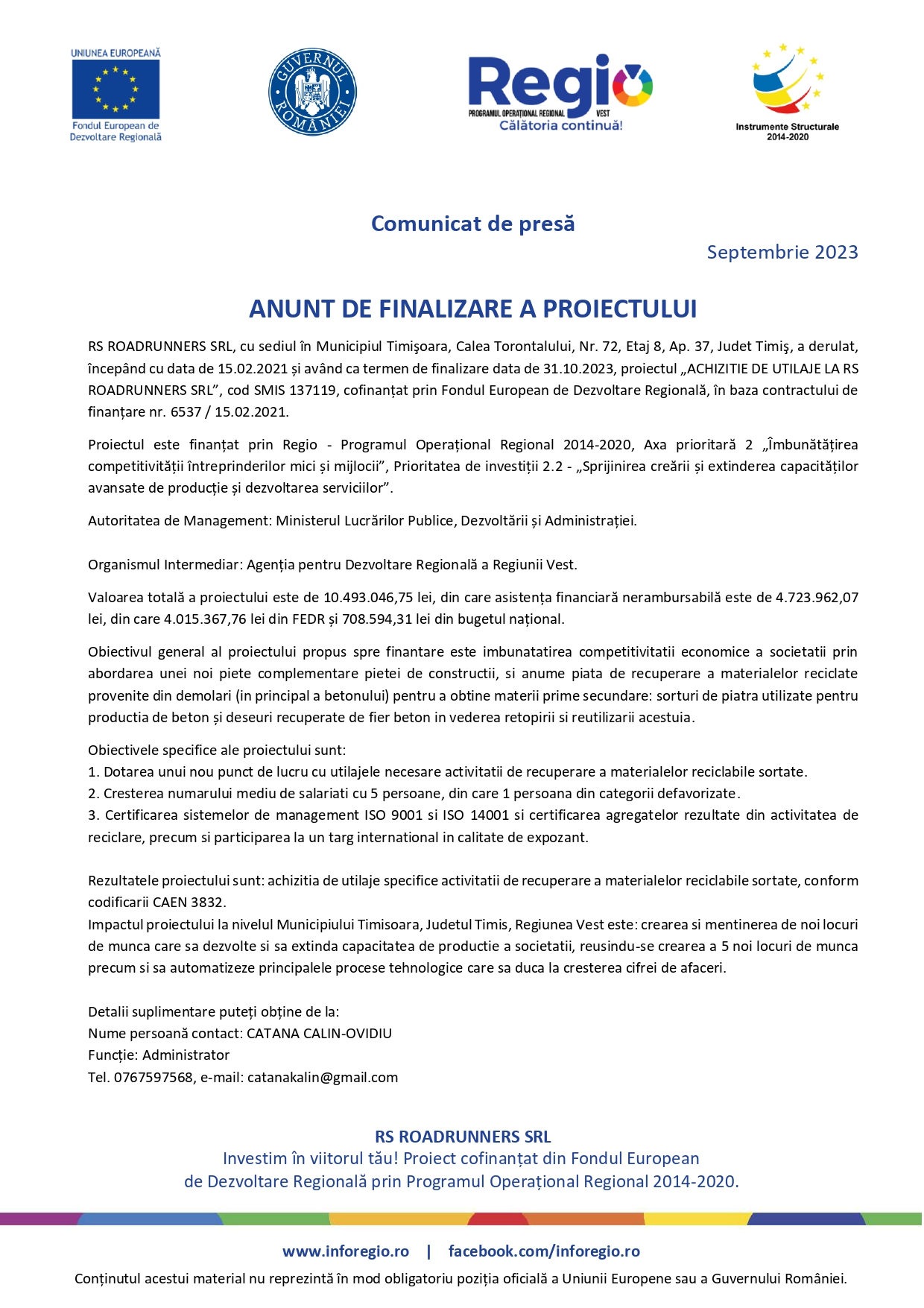 ANUNT DE FINALIZARE A PROIECTULUI RS ROADRUNNERS SRL, cu sediul în Municipiul Timişoara, Calea Torontalului, Nr. 72, Etaj 8, Ap. 37, Judet Timiş, a derulat, începând cu data de 15.02.2021 și având ca termen de finalizare data de 31.10.2023, proiectul „ACHIZITIE DE UTILAJE LA RS ROADRUNNERS SRL”, cod SMIS 137119, cofinanțat prin Fondul European de Dezvoltare Regională, în baza contractului de finanțare nr. 6537 / 15.02.2021.