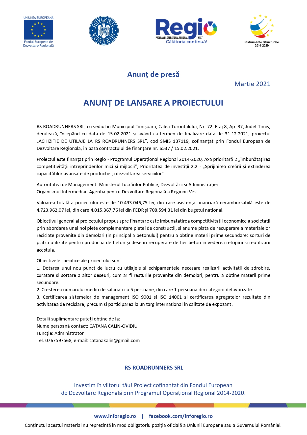RS ROADRUNNERS SRL, cu sediul în Municipiul Timişoara, Calea Torontalului, Nr. 72, Etaj 8, Ap. 37, Judet Timiş, derulează, începând cu data de 15.02.2021 și având ca termen de finalizare data de 31.12.2021, proiectul „ACHIZITIE DE UTILAJE LA RS ROADRUNNERS SRL”, cod SMIS 137119, cofinanțat prin Fondul European de Dezvoltare Regională, în baza contractului de finanțare nr. 6537 / 15.02.2021.