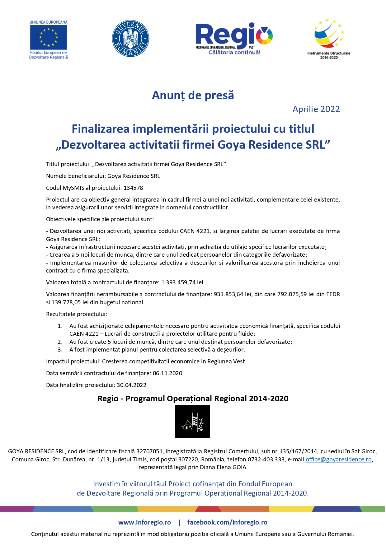 Finalizarea implementării proiectului cu titlul „Dezvoltarea activitatii firmei Goya Residence SRL”
