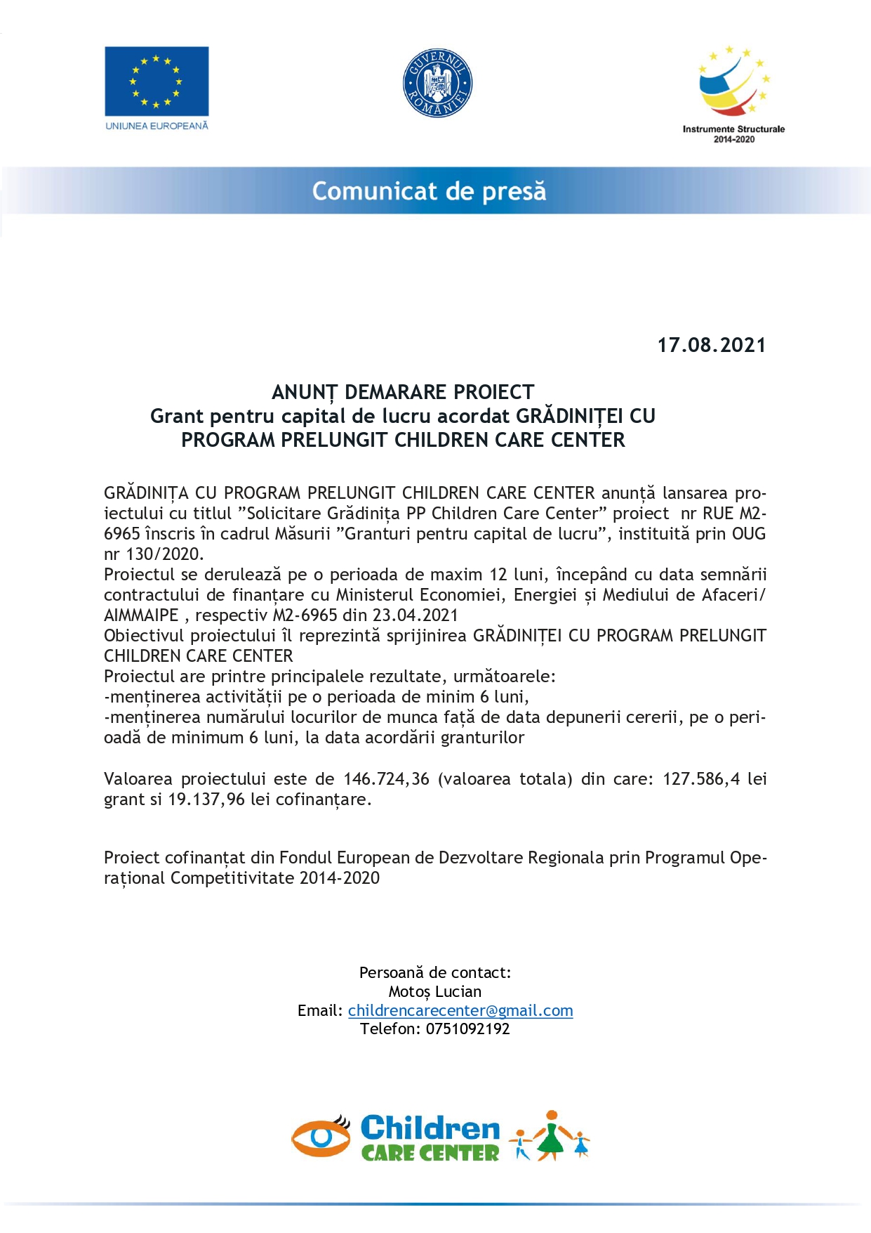 GRĂDINIȚA CU PROGRAM PRELUNGIT CHILDREN CARE CENTER anunță lansarea proiectului cu titlul ”Solicitare Grădinița PP Children Care Center” proiect nr RUE M2- 6965 înscris în cadrul Măsurii ”Granturi pentru capital de lucru”, instituită prin OUG nr 130/2020.