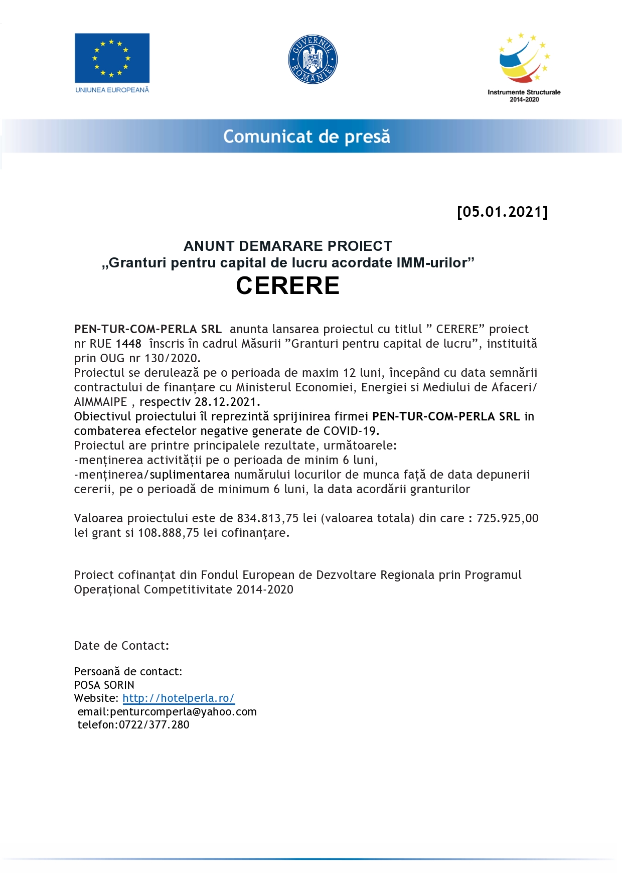 PEN-TUR-COM-PERLA SRL anunta lansarea proiectul cu titlul ” CERERE” proiect nr RUE 1448 înscris în cadrul Măsurii ”Granturi pentru capital de lucru”, instituită prin OUG nr 130/2020.