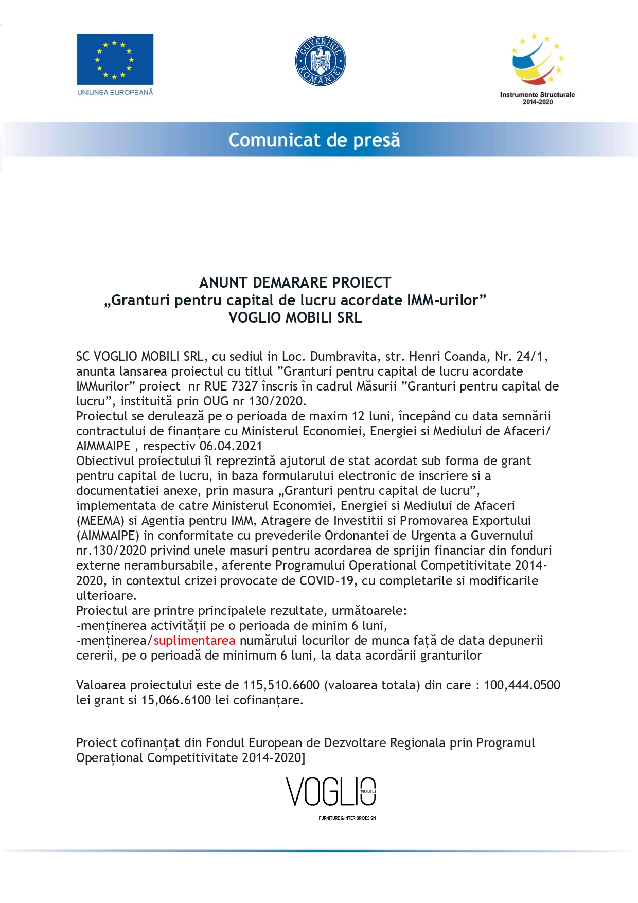 SC VOGLIO MOBILI SRL, cu sediul in Loc. Dumbravita, str. Henri Coanda, Nr. 24/1, anunta lansarea proiectul cu titlul ”Granturi pentru capital de lucru acordate IMMurilor” proiect nr RUE 7327 înscris în cadrul Măsurii ”Granturi pentru capital de lucru”, instituită prin OUG nr 130/2020.