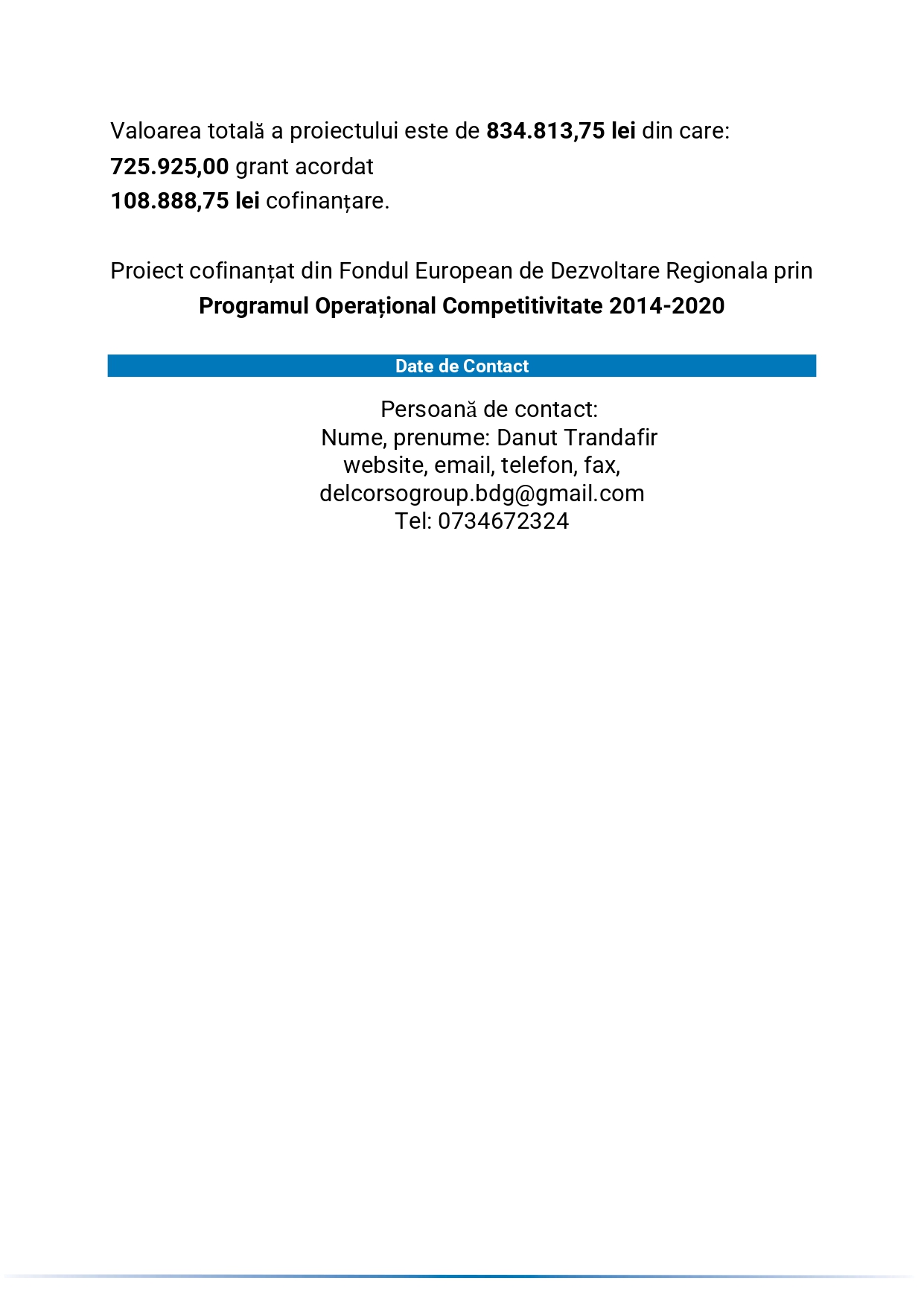 Anunț finalizare implementare proiect “Granturi pentru capital de lucru acordate beneficiarilor” – SC DEL CORSO FAMILY SRL