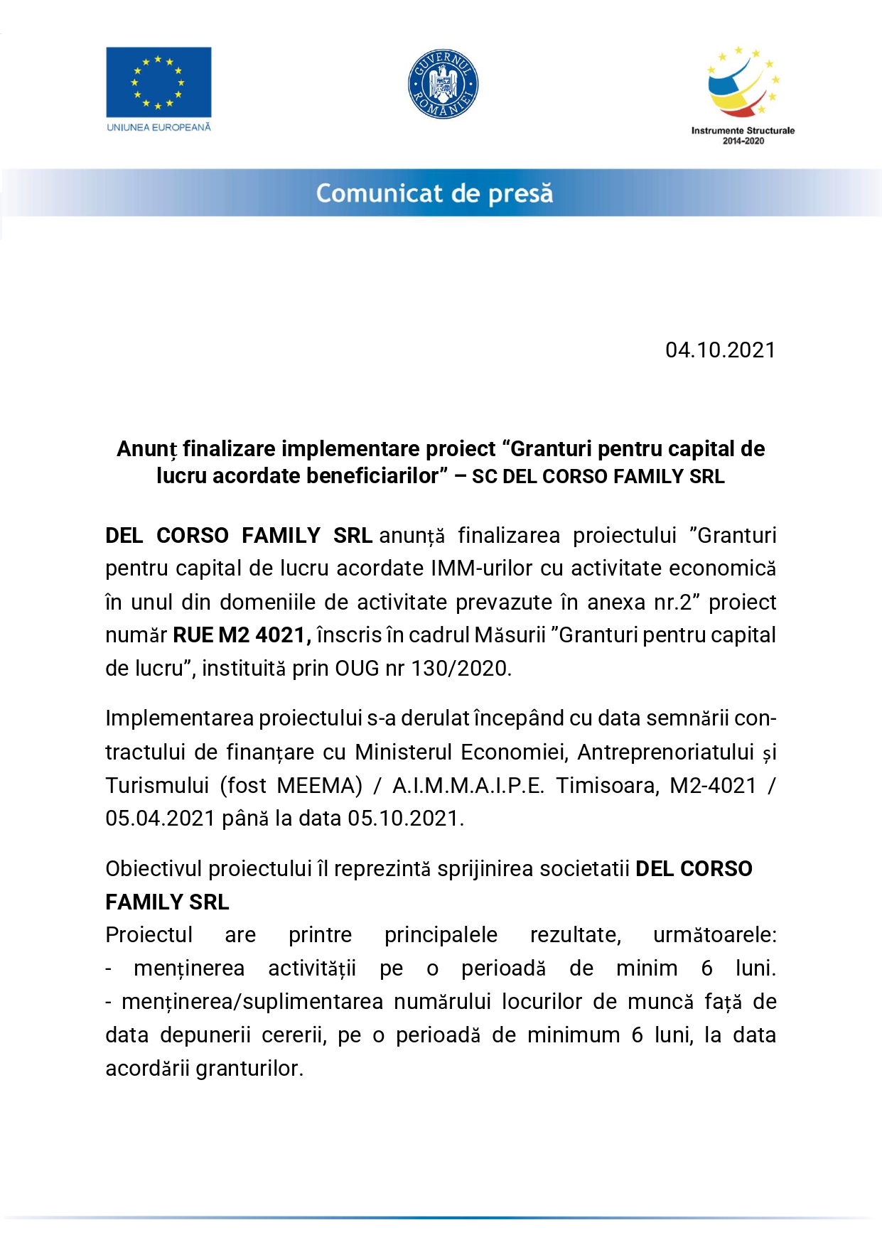 DEL CORSO FAMILY SRL anunță finalizarea proiectului ”Granturi pentru capital de lucru acordate IMM-urilor cu activitate economică în unul din domeniile de activitate prevazute în anexa nr.2” proiect număr RUE M2 4021, înscris în cadrul Măsurii ”Granturi pentru capital de lucru”, instituită prin OUG nr 130/2020.