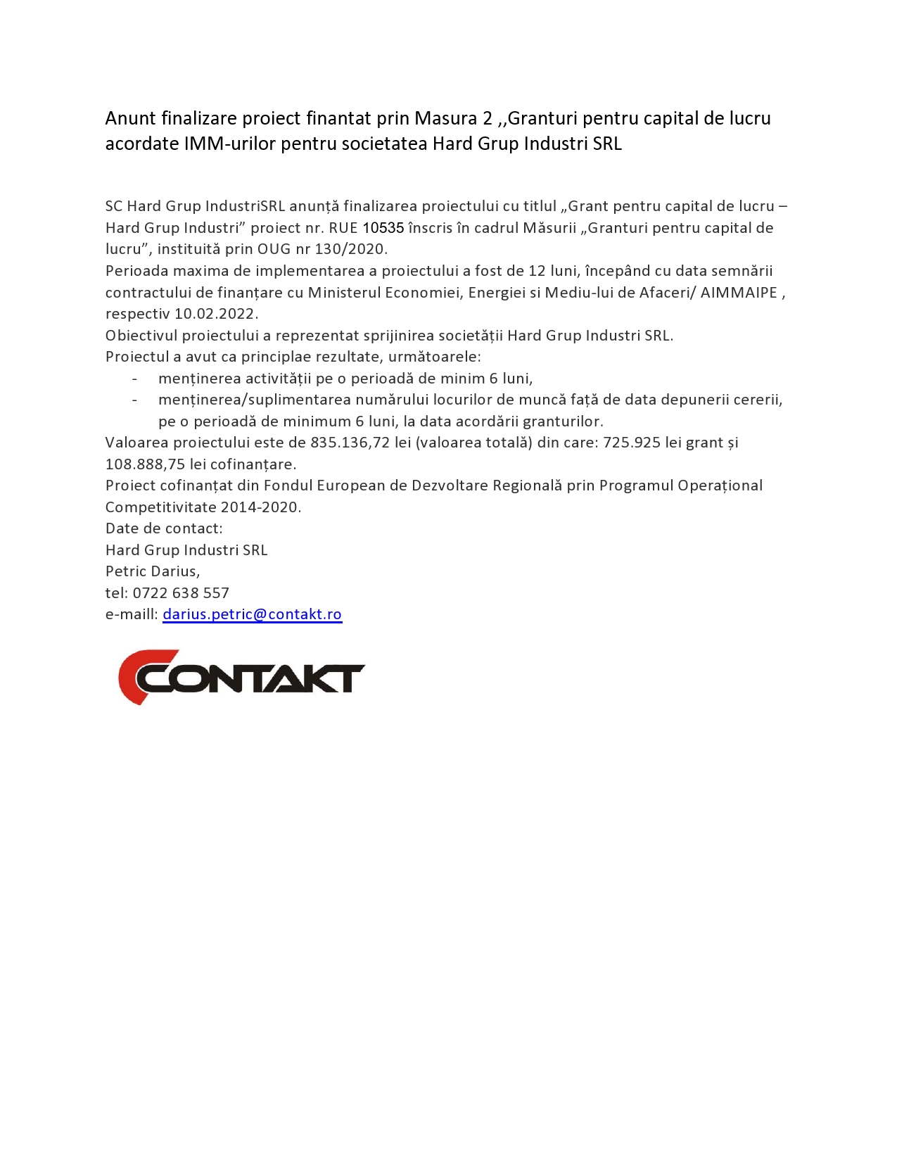 SC Hard Grup IndustriSRL anunță finalizarea proiectului cu titlul „Grant pentru capital de lucru – Hard Grup Industri” proiect nr. RUE 10535 înscris în cadrul Măsurii „Granturi pentru capital de lucru”, instituită prin OUG nr 130/2020.