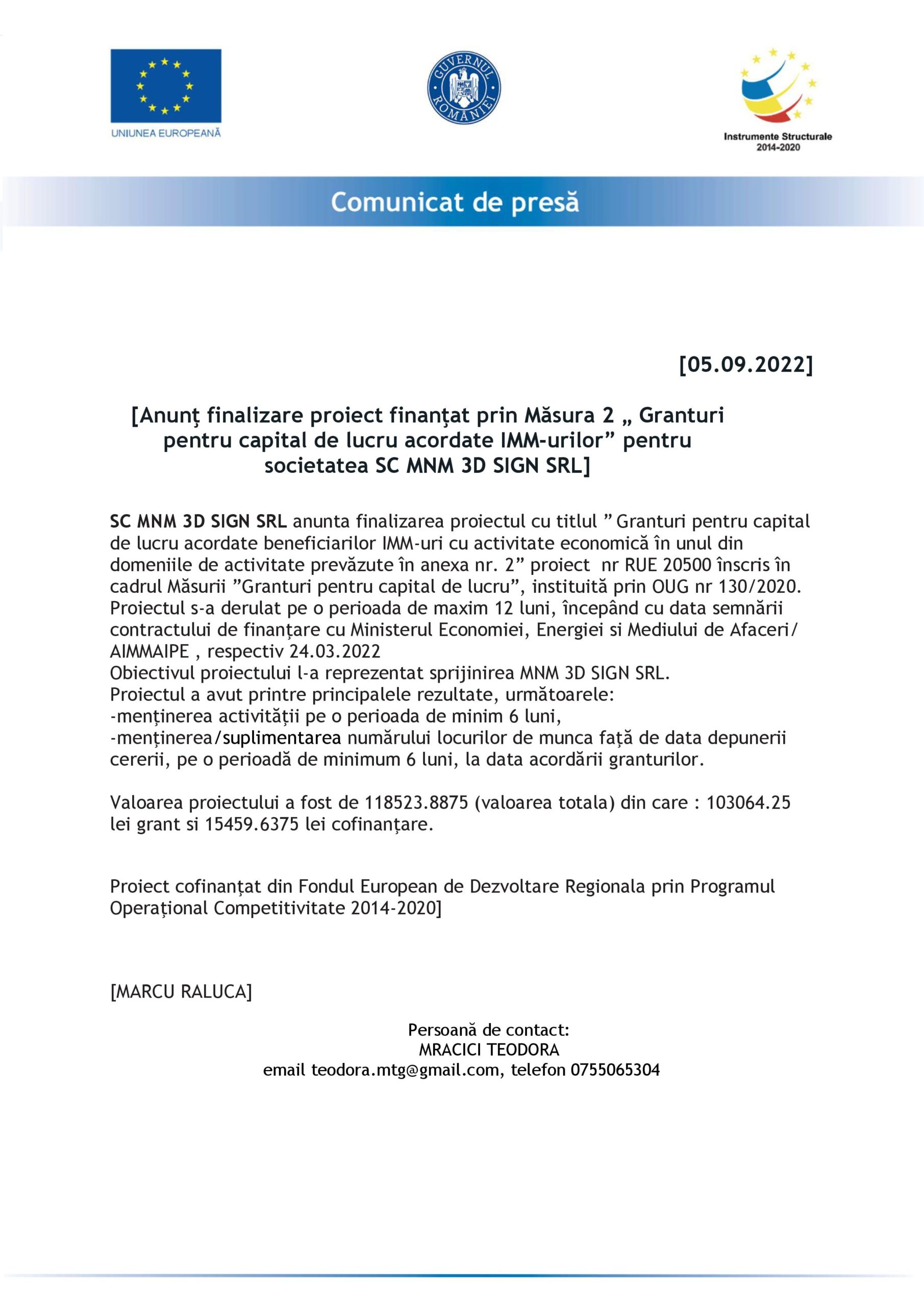 Anunţ finalizare proiect finanţat prin Măsura 2 „ Granturi pentru capital de lucru acordate IMM-urilor” pentru societatea SC MNM 3D SIGN SRL
