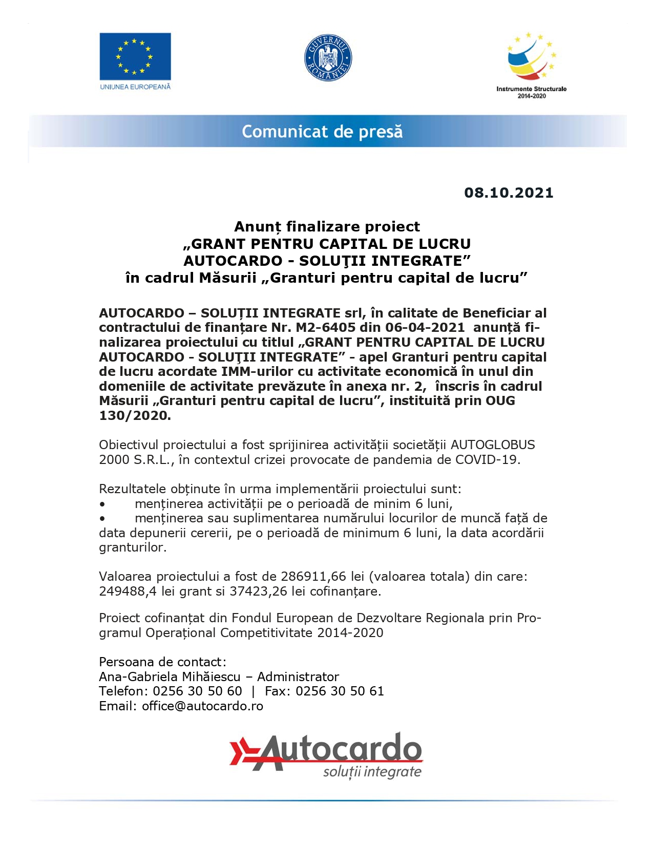 Anunț finalizare proiect „GRANT PENTRU CAPITAL DE LUCRU AUTOCARDO – SOLUŢII INTEGRATE” în cadrul Măsurii „Granturi pentru capital de lucru”