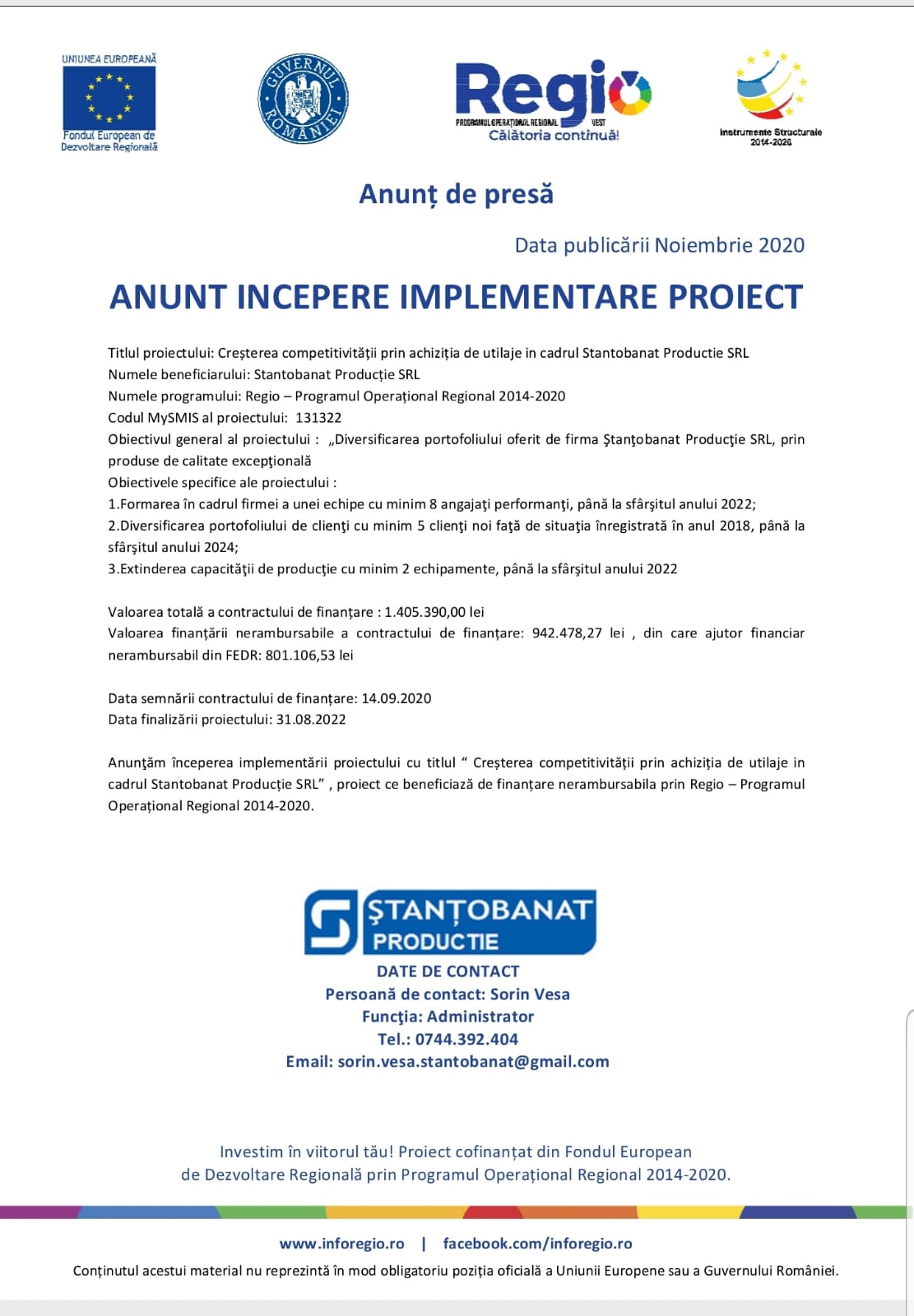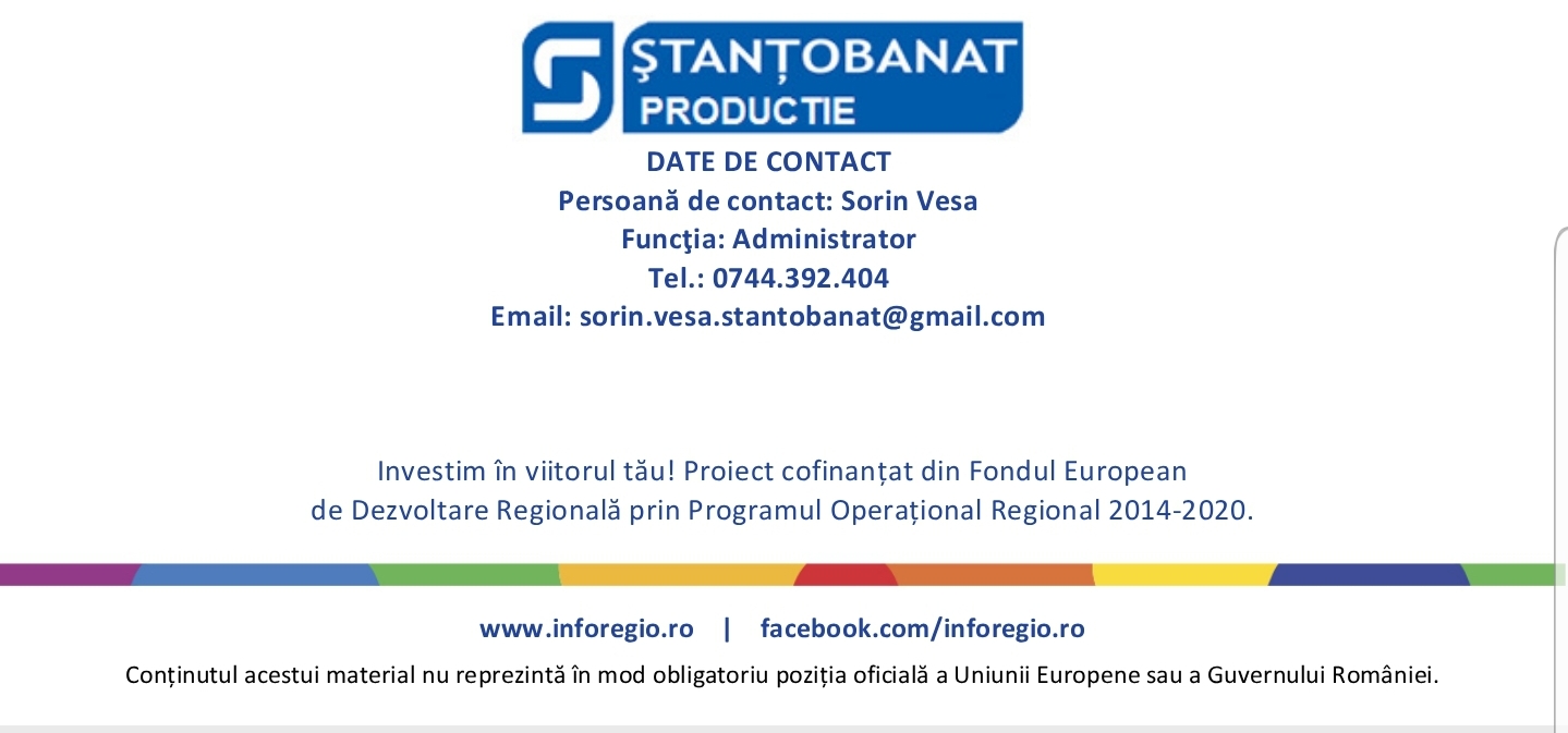Anunţăm începerea implementării proiectului cu titlul “Creșterea competitivității prin achiziția de utilaje in cadrul Stantobanat Producție SRL” , proiect ce beneficiază de finanțare nerambursabila prin Regio – Programul Operațional Regional 2014-2020.