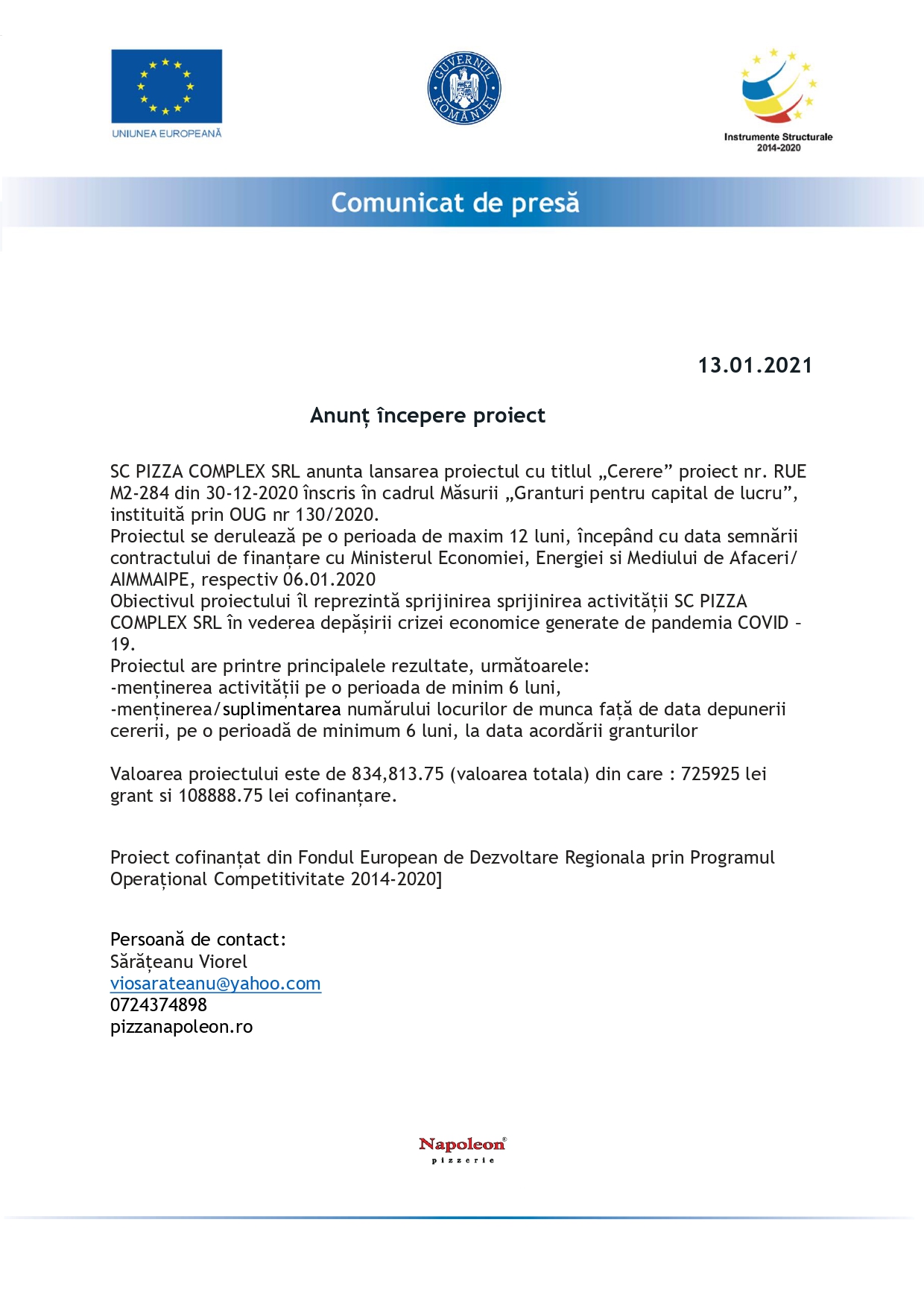 SC PIZZA COMPLEX SRL anunta lansarea proiectul cu titlul „Cerere” proiect nr. RUE M2-284 din 30-12-2020 înscris în cadrul Măsurii „Granturi pentru capital de lucru”, instituită prin OUG nr 130/2020.