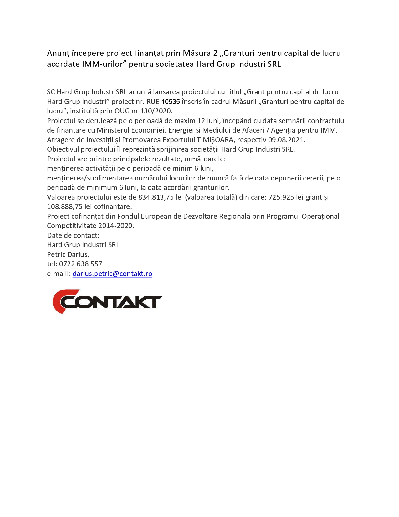Anunț începere proiect finanțat prin Măsura 2 „Granturi pentru capital de lucru acordate IMM-urilor” pentru societatea Hard Grup Industri SRL