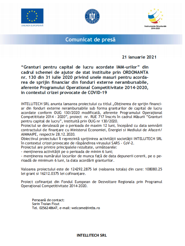 INTELLITECH SRL anunta lansarea proiectului cu titlul „Obținerea de sprijin financi ar din fonduri externe nerambursabile sub forma granturilor de capital de lucru acordate conform OUG 130/2020 modificată, aferente Programului Operațional Competititate 2014 – 2020”, proiect nr. RUE 717 înscris în cadrul Măsurii ”Granturi pentru capital de lucru”, instituită prin OUG nr 130/2020. Proiectul se derulează pe o perioada de maxim 12 luni, începând cu data semnării contractului de finanțare cu Ministerul Economiei, Energiei si Mediului de Afaceri/ AIMMAIPE, respectiv 28.12.2020.