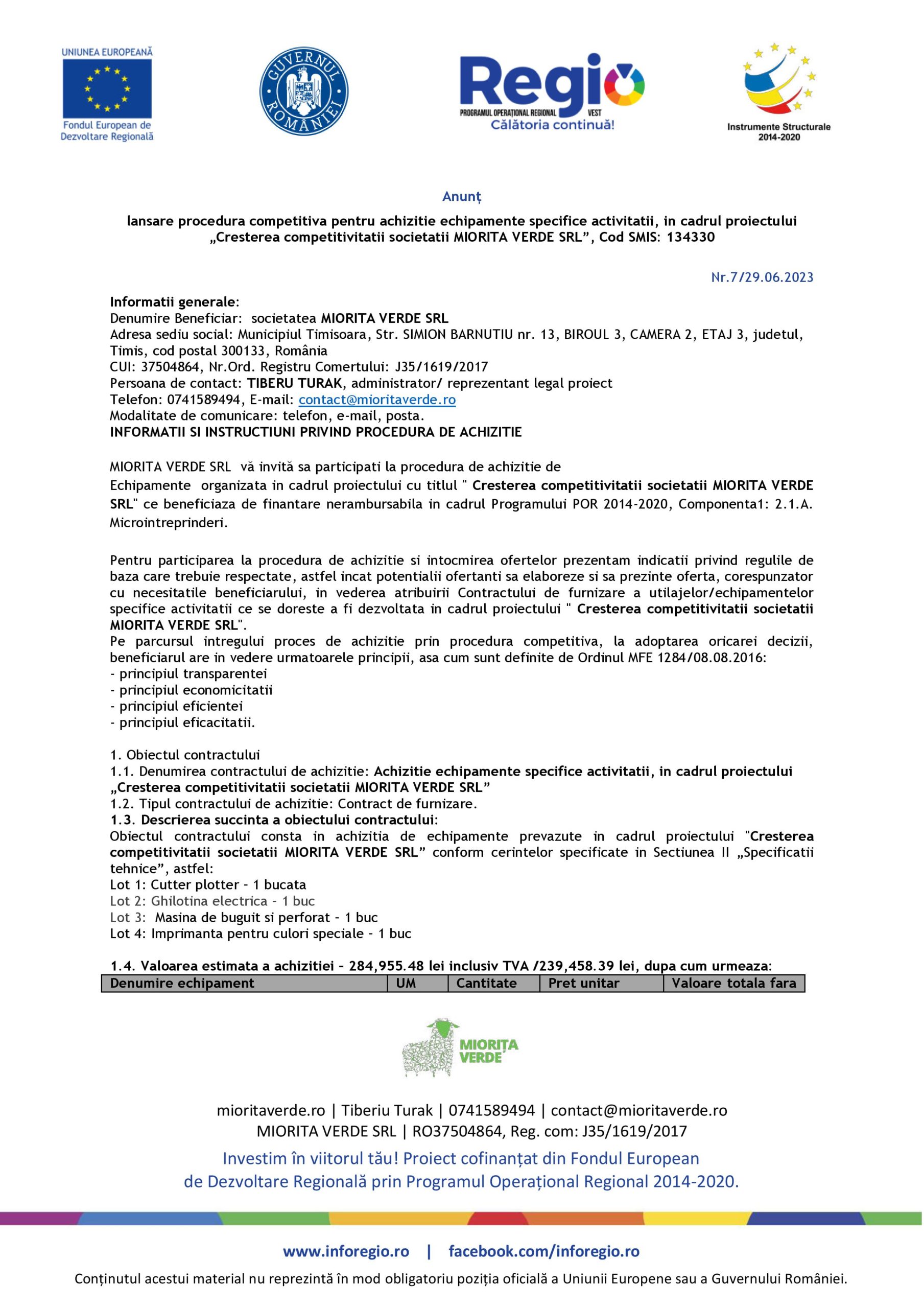 Anunț lansare procedura competitiva pentru achizitie echipamente specifice activitatii, in cadrul proiectului „Cresterea competitivitatii societatii MIORITA VERDE SRL”, Cod SMIS: 134330