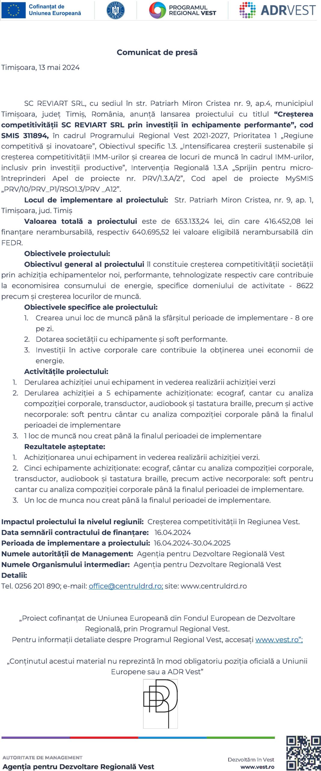 SC REVIART SRL, cu sediul în str. Patriarh Miron Cristea nr. 9, ap.4, municipiul Timișoara, județ Timiș, România, anunță lansarea proiectului cu titlul “Creșterea competitivității SC REVIART SRL prin investiții în echipamente performante”, cod SMIS 311894, în cadrul Programului Regional Vest 2021-2027, Prioritatea 1 „Regiune competitivă și inovatoare”, Obiectivul specific 1.3. „Intensificarea creșterii sustenabile și creșterea competitivității IMM-urilor și crearea de locuri de muncă în cadrul IMM-urilor, inclusiv prin investiții productive”, Intervenția Regională 1.3.A „Sprijin pentru micro–întreprinderi Apel de proiecte nr. PRV/1.3.A/2”, Cod apel de proiecte MySMIS „PRV/10/PRV_P1/RSO1.3/PRV _A12”.