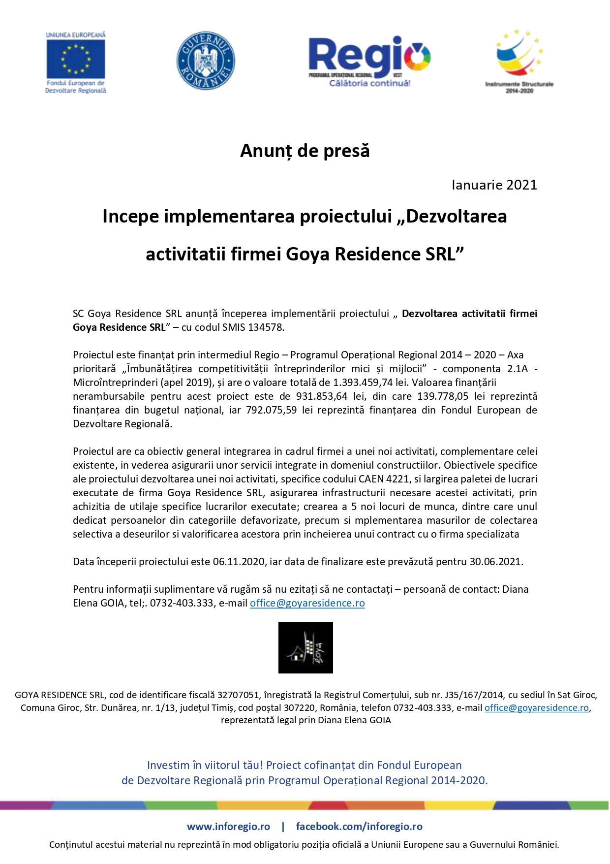 Anunț de presă: Începe implementarea proiectului „Dezvoltarea activității firmei Goya Residence SRL”