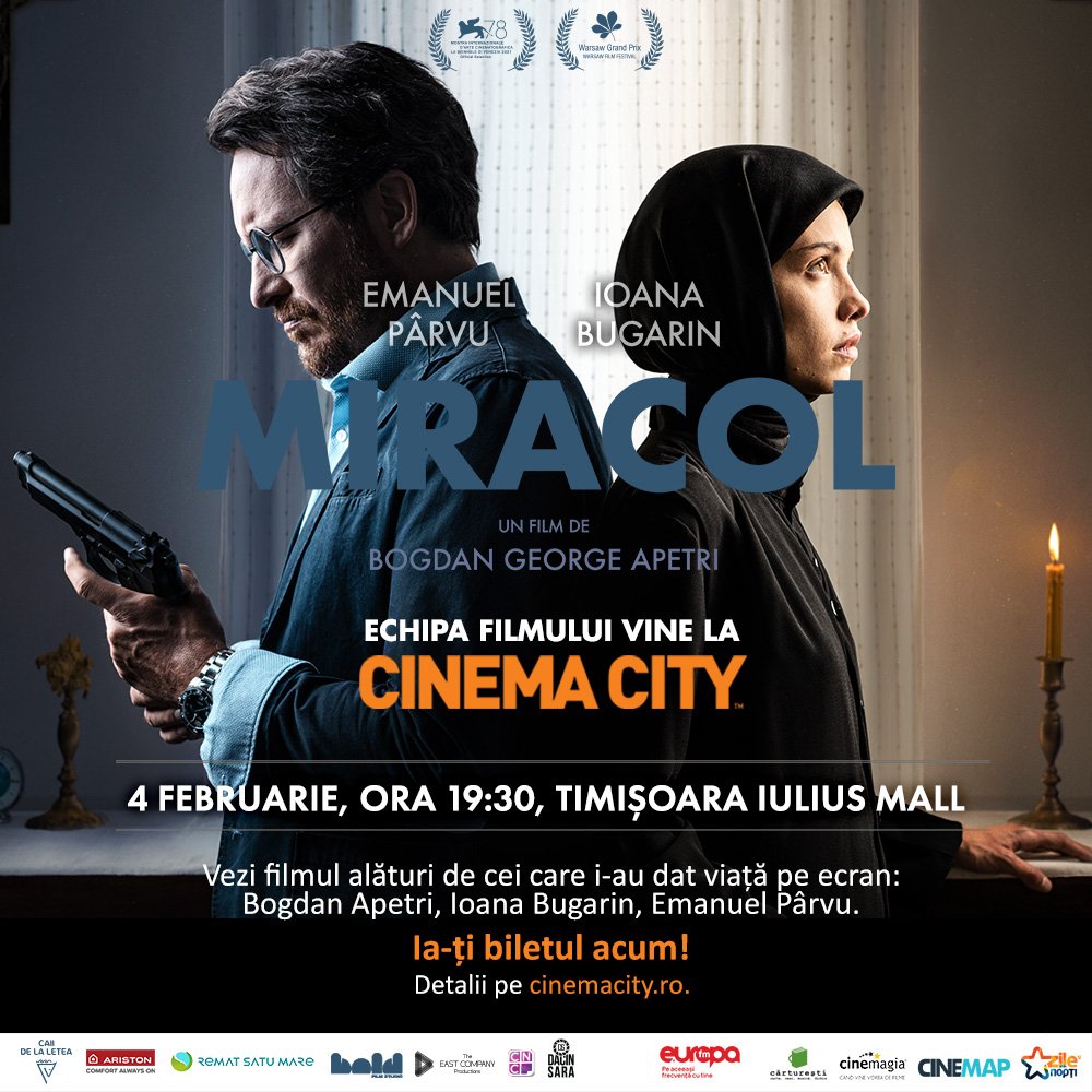 Vineri, 4 februarie, cinefilii au parte de o surpriză. Bogdan Apetri, Ioana Bugarin și Emanuel Pârvu vin de la ora 19:30, în Iulius Mall, la Cinema City, unde va avea loc avanpremiera filmului „Miracol”. Vino și tu să afli povestea personajului Cristina Tofan, dar și detalii din culise!