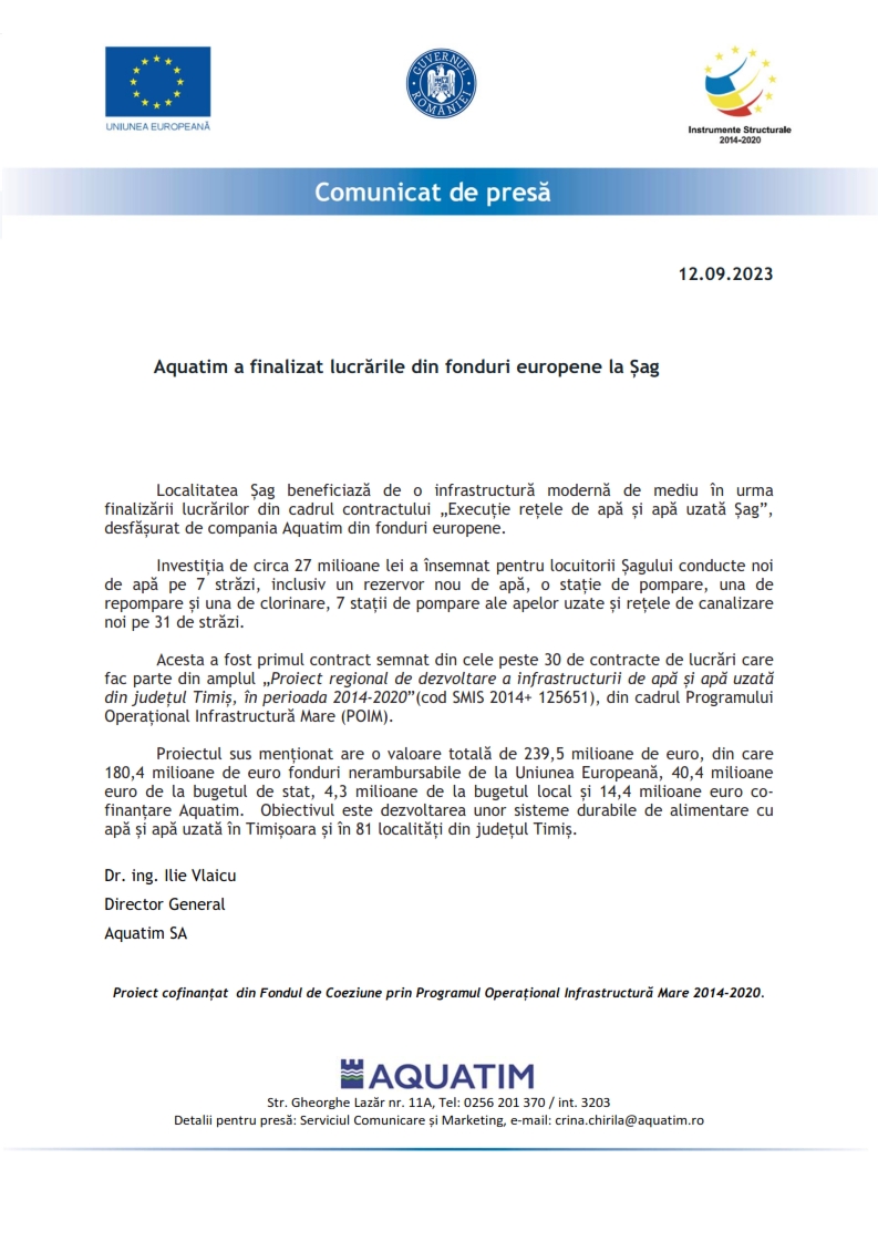 Acesta a fost primul contract semnat din cele peste 30 de contracte de lucrări care fac parte din amplul „Proiect regional de dezvoltare a infrastructurii de apă și apă uzată din județul Timiș, în perioada 2014-2020”(cod SMIS 2014+ 125651), din cadrul Programului Operațional Infrastructură Mare (POIM).