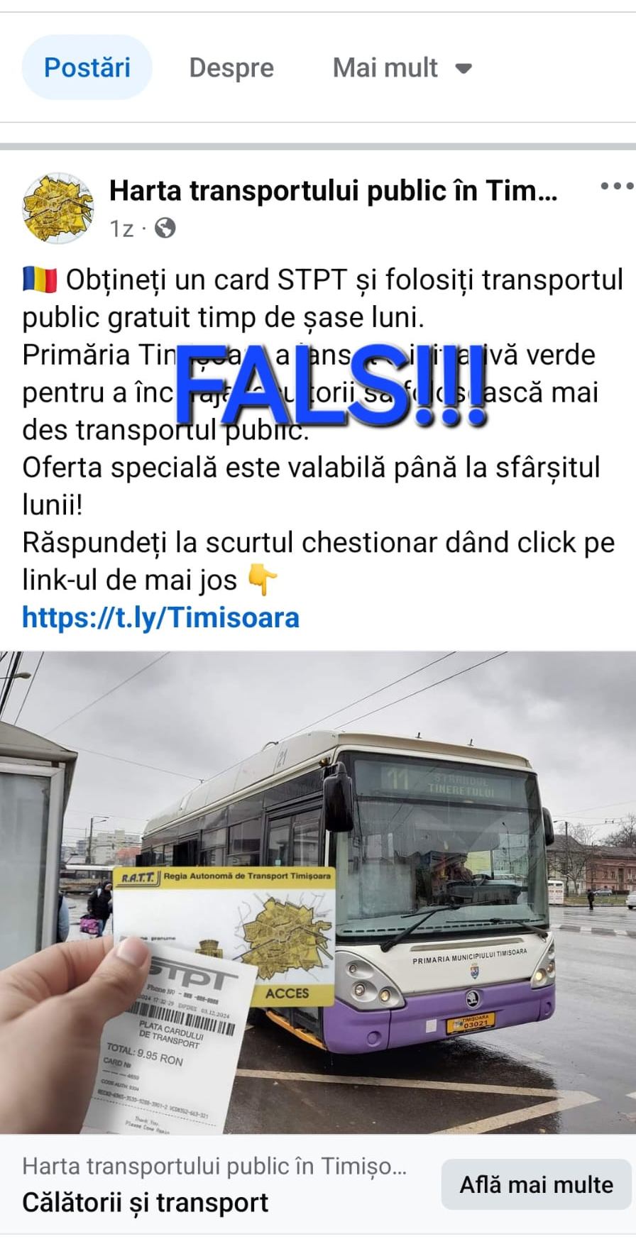 STPT și Primăria Timișoara nu au lansat nicio astfel de campanie sau ofertă specială. Vă rugăm să nu accesați link-urile și să nu furnizați date personale în urma acestor mesaje false”, transmit reprezentanții STPT.