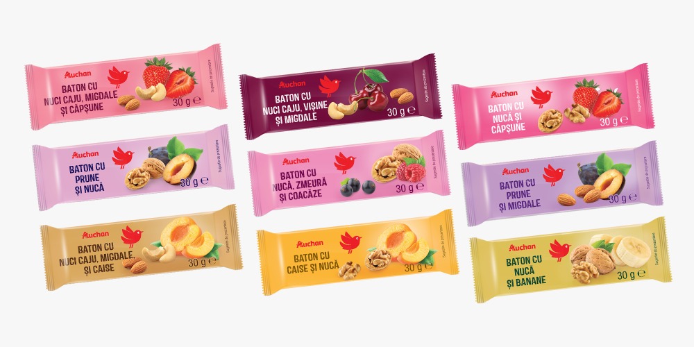- Gama de batoane cu fructe Auchan – câștigătoare în categoria „Batoane cu nuci și fructe”, formată din 9 sortimente produse în România și caracterizată de echilibrul dintre gust natural, ingrediente de calitate și forma practică.
