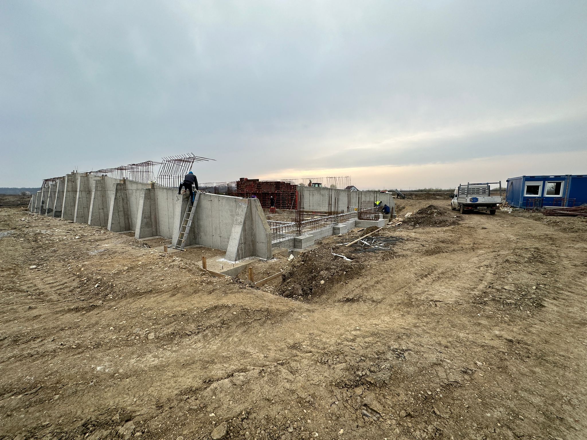 În prezent, se lucrează la pereții de sprijin și elementele de contrafort, se execută umpluturile în fundație și se montează carcasele cu buloane pentru prinderea acoperișului.