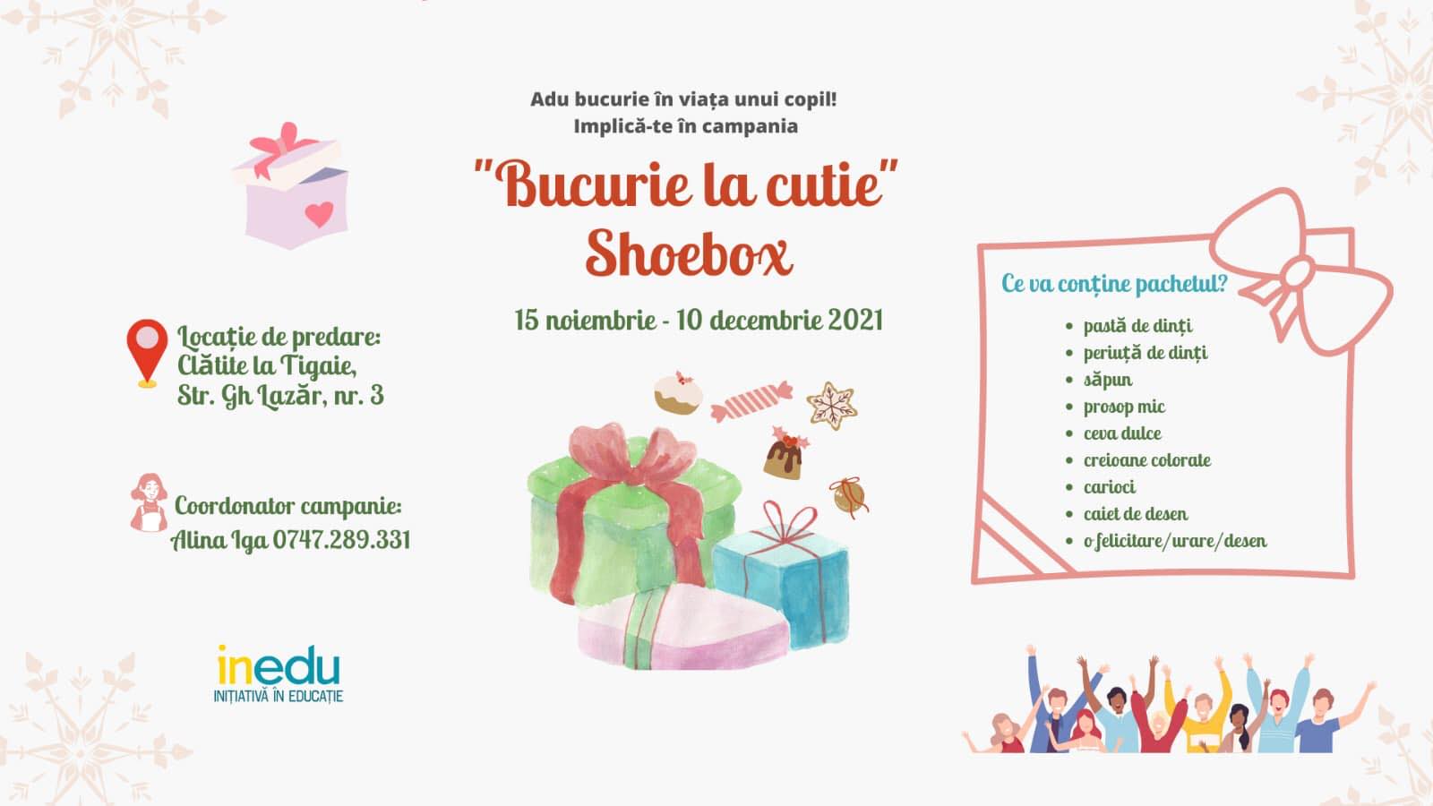 500 de copii vulnerabili, care au o situație materială modestă, vor primi rechizite și produse de igienă prin campania „Bucurie la cutie”. Doritorii pot face pachete care să conțină: pastă de dinți, periuță de dinți, săpun, un prosop mic, ceva dulce, creioane colorate, carioci, caiet de desen și o felicitare, o urare sau un desen care să completeze darurile.