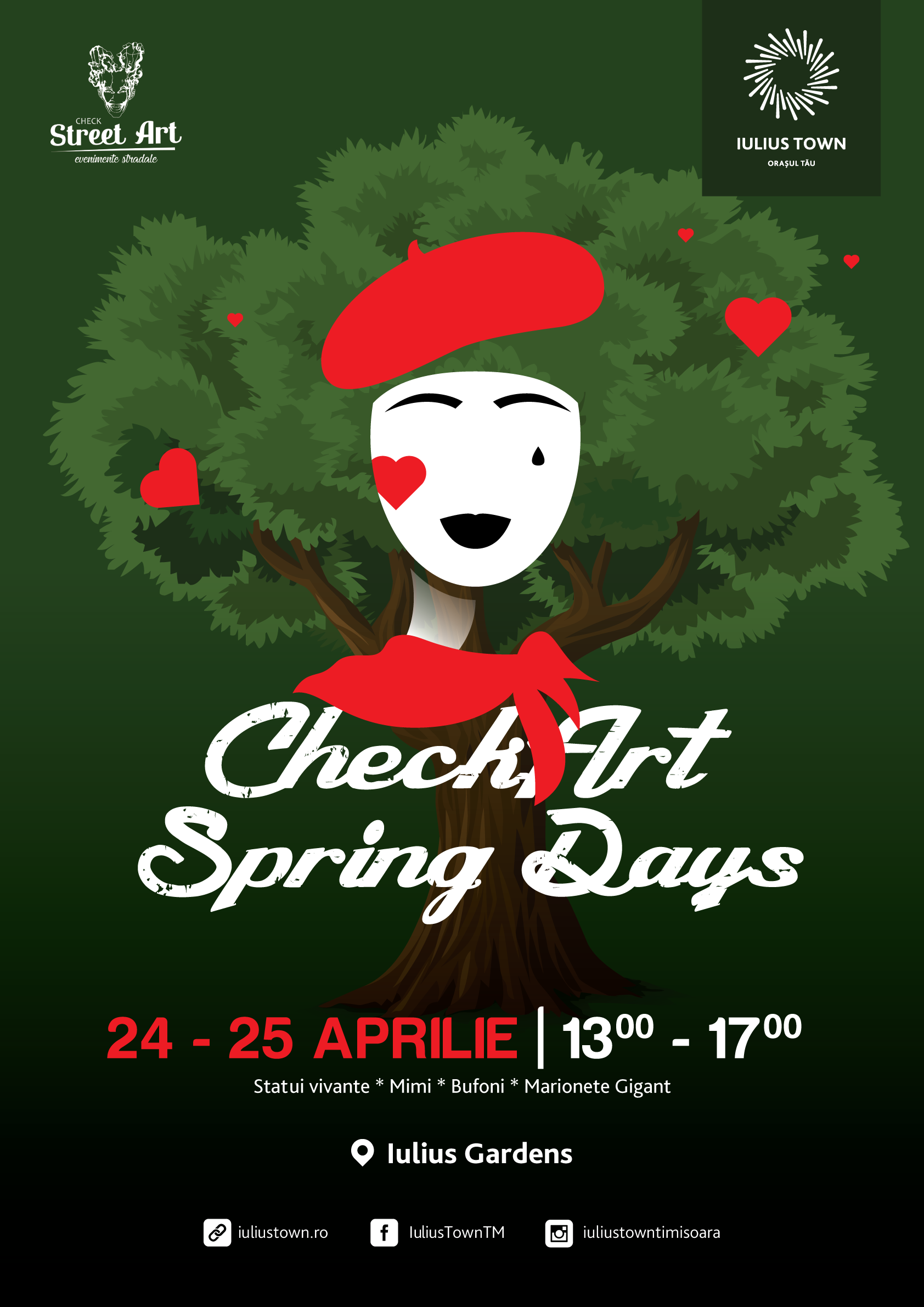 Râsetele și momentele de fericire sunt cele mai frumoase experiențe ale noastre. În Iulius Gardens, mimii și bufonii sunt pregătiți să te facă să uiți pentru câteva clipe de grijile cotidiene și să îi încânte pe copii. Distracția cu „regii comediei” va avea loc între orele 13.00 – 14.00 și 15.00 – 16.00. Dacă vremea nu va fi prietenoasă, Check Art Spring Days se va muta în interiorul Iulius Mall.