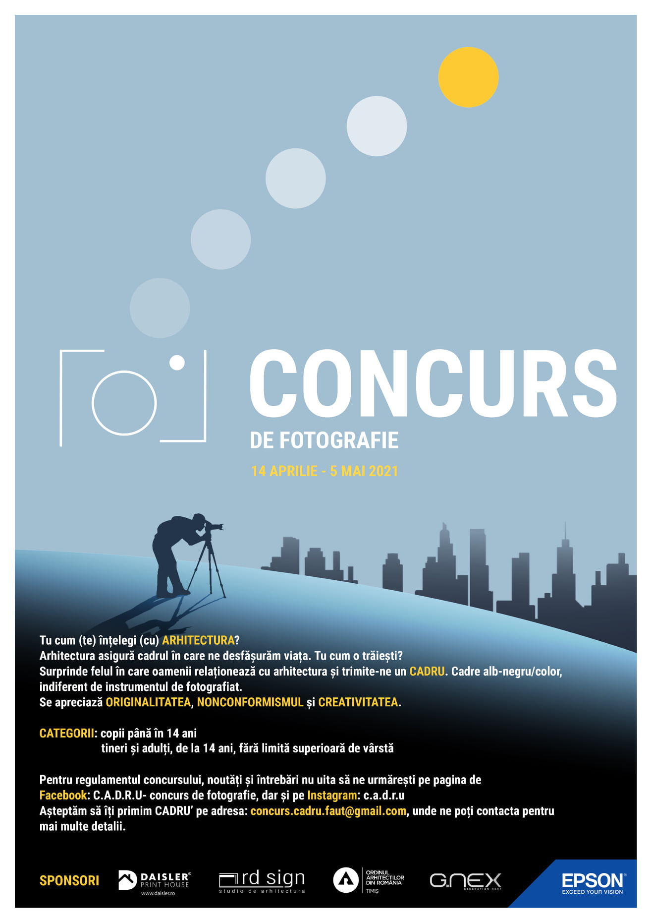 Studenții anului IV de la Facultatea de Arhitectură Timișoara (FAUT) organizează concursul „CADRU” pentru toți cei pasionați de arhitectură sau fotografie. Surprinde felul în care relaționează oamenii cu arhitectura și trimite un cadru alb-negru sau color.