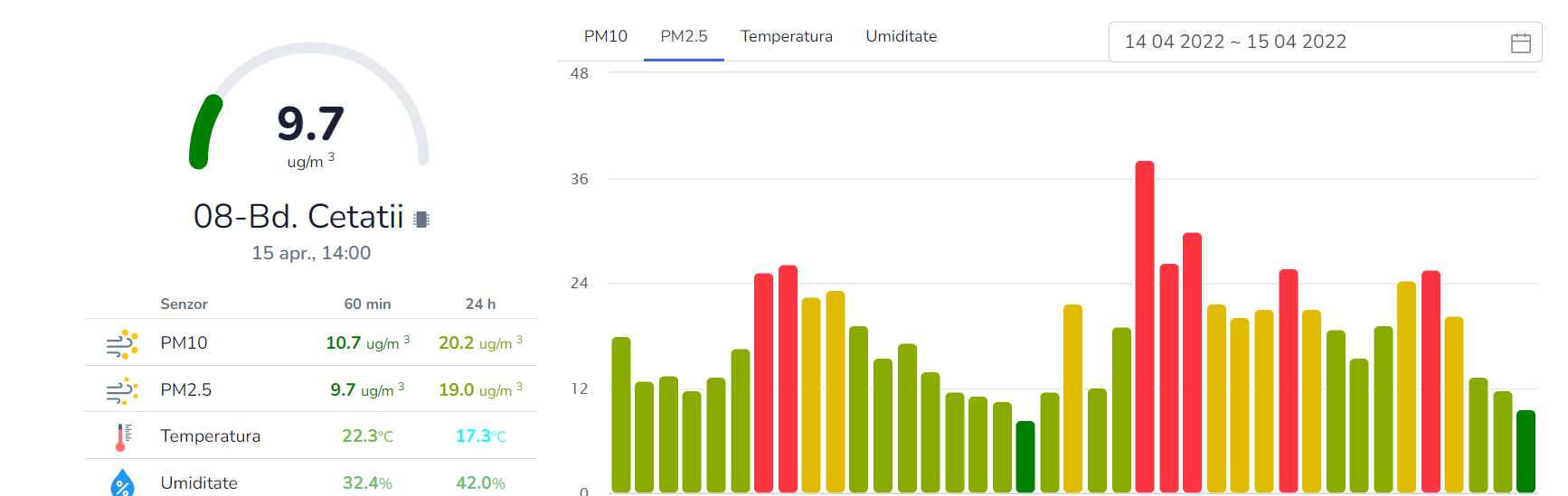Datele de pe airdata.ro pentru Bd. Cetății arată valori mai mari la PM 2.5 în intervalul orar 22-00, și de 38.1 ug/m 3.