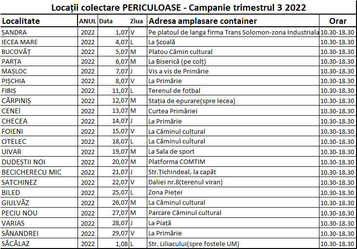 Cetățenii din localităţie menţionate mai sus pot depune prin aport voluntar și gratuit deșeurile periculoase din menajer în containerele special puse la dispoziție în punctele de colectare și între orele menționate în tabelul de mai jos.