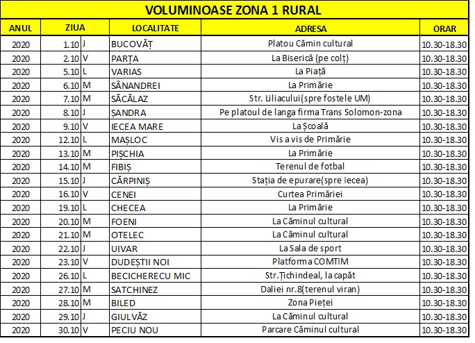 Cetățenii din localităţie menţionate mai sus pot depune prin aport voluntar deșeurile voluminoase în containerele special puse la dispoziție în punctele de colectare și între orele menționate în tabelul de mai jos.