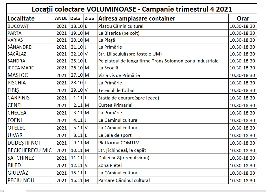 Cetățenii din localităţile menţionate mai sus pot depune prin aport voluntar și gratuit deșeurile voluminoase în containerele special puse la dispoziție în punctele de colectare și între orele menționate în tabelul de mai jos.