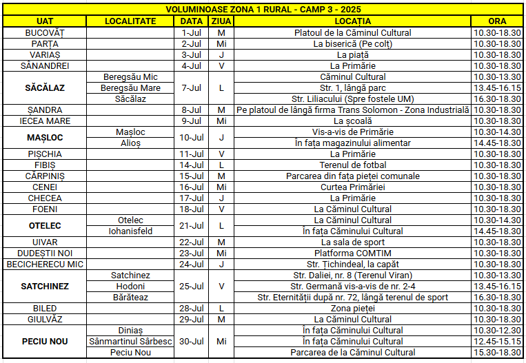Cetățenii din localitățile menționate mai sus pot preda gratuit prin aport voluntar deșeurile voluminoase în containerele special amplasate la punctele de colectare, în intervalul orar specificat în programul de mai jos.