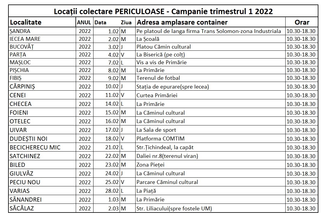 Astfel, în perioada 01 februarie – 02 martie 2022 se desfăşoară o campanie dedicată colectării deșeurilor periculoase din menajer în zona 1 rural a judeţului Timiş. Sunt incluse localitățile Bucovăț, Parța, Variaș, Sânandrei, Săcălaz, Șandra, Iecea Mare, Mașloc, Pișchia, Fibiș, Cărpiniș, Cenei, Checea, Foeni, Otelec, Uivar, Dudeștii Noi, Becicherecu Mic, Satchinez, Biled, Giulvăz, Peciu Nou.