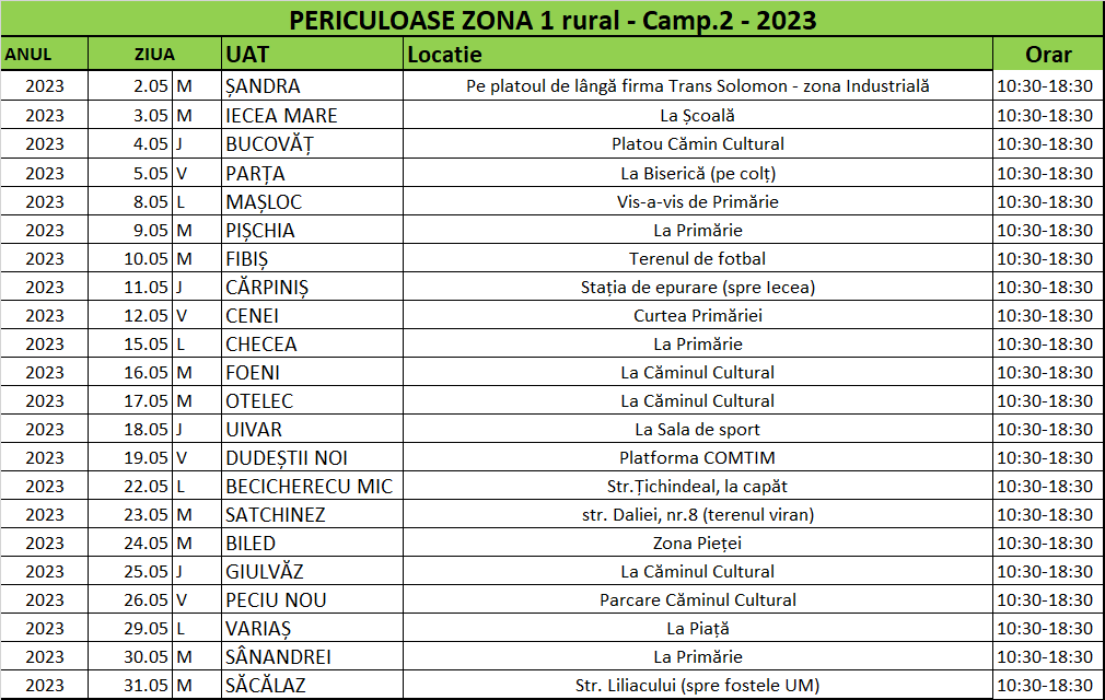 Astfel, în perioada 2 – 31 mai 2023 se desfăşoară o campanie dedicată colectării deșeurilor periculoase din menajer în zona 1 rural a judeţului Timiş. Sunt incluse localitățile Șandra, Iecea Mare, Bucovăț, Parța, Mașloc, Pișchia, Fibiș, Cărpiniș, Cenei, Checea, Foeni, Otelec, Uivar, Dudeștii Noi, Becicherecu Mic, Satchinez, Biled, Giulvăz, Peciu Nou, Variaș, Sânadrei, Săcălaz.