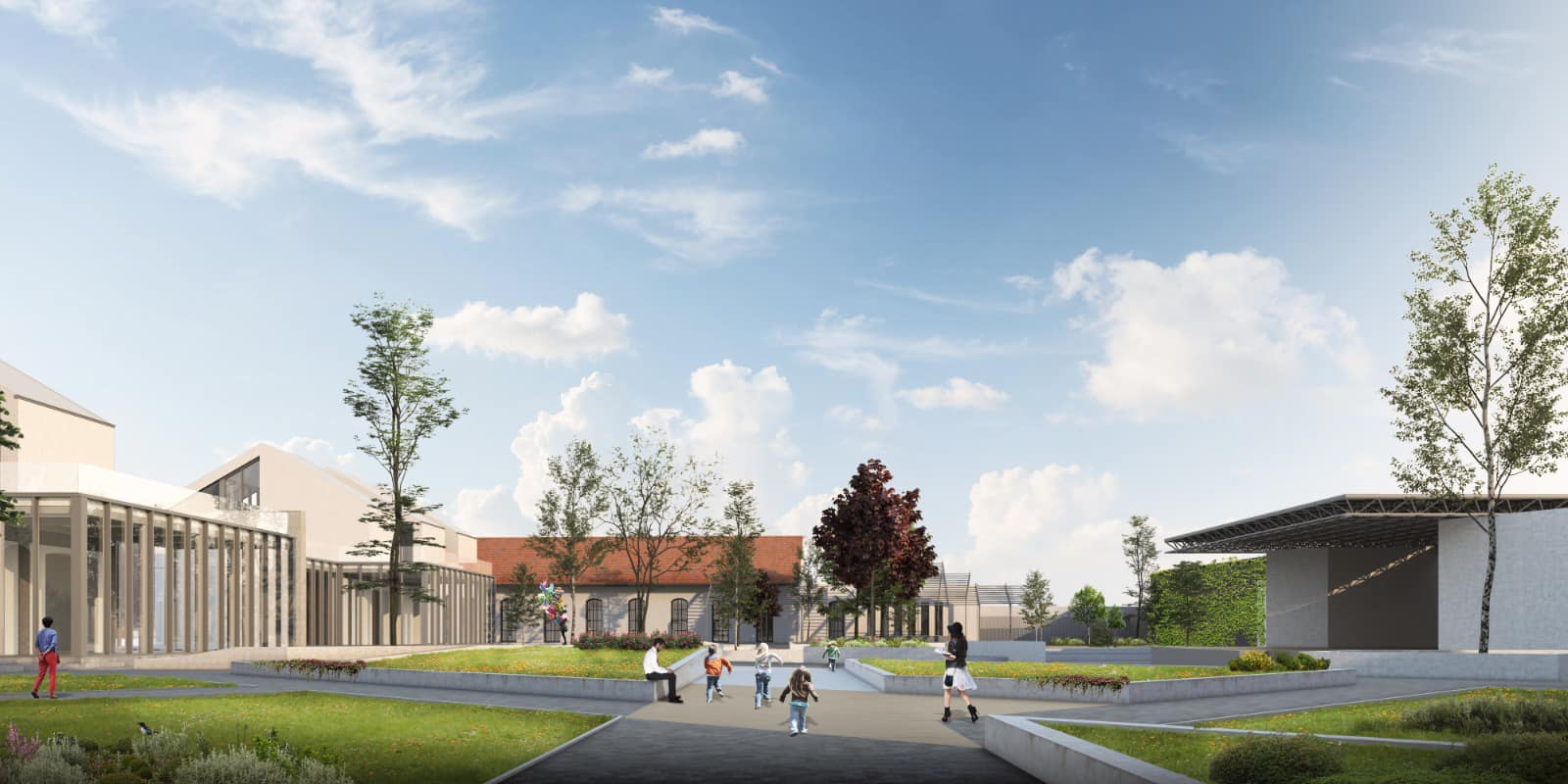 În curte va exista un spațiu de joacă pentru copii, dar și o terasă exterioară acoperită, pentru susținerea vegetației. În fața scenei va fi creat un amfiteatru cu rampe de acces pentru persoanele cu dizabilități.