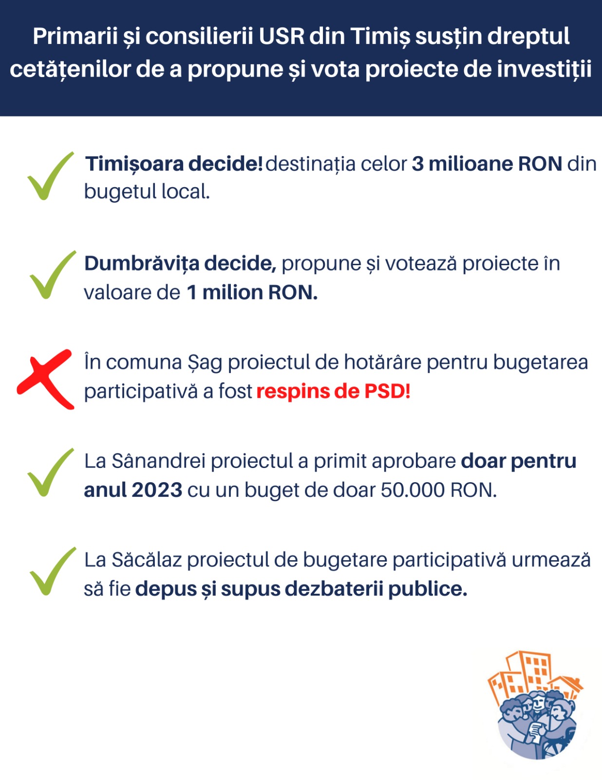 Primăriile și Consiliile Județene din România pot aloca 5% din valoarea bugetului general către bugetul participativ, un instrument prin care cetățenii pot propune și decide prin vot proiectele prioritare pentru ei. Pentru programul „Timișoara decide!” – primul program de bugetare participativă al municipiului Timișoara, născut din ideile, soluțiile și nevoile formulate de timișoreni – au … Continue reading Cetățenii din Timiș pot propune și vota proiecte de investiții! Primarii și consilierii USR îi susțin