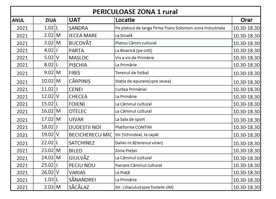 Cetățenii din localităţie menţionate mai sus pot depune prin aport voluntar deșeurile periculoase în containerele special puse la dispoziție în punctele de colectare și între orele menționate în tabelul de mai jos.