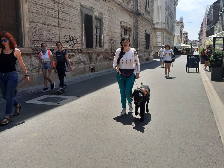 „Ne uităm în zona pe care Simona a parcurs-o verificând rutele, să ne asigurăm că ea știe să dea comenzile potrivite acolo unde trebuie să schimbe direcția sau unde trebuie să-l încurajeze pe Chilli, să-i dea semnalul la trecerea de pietoni. În Timișoara n-am găsit niciun covor tactil. Sunt esențiale pentru persoanele cu probleme de vedere pentru că aceasta este referința fizică de care ei au nevoie să se oprească în zone în care trebuie să depună mai multă atenție”, mai spune Camelia Platt.