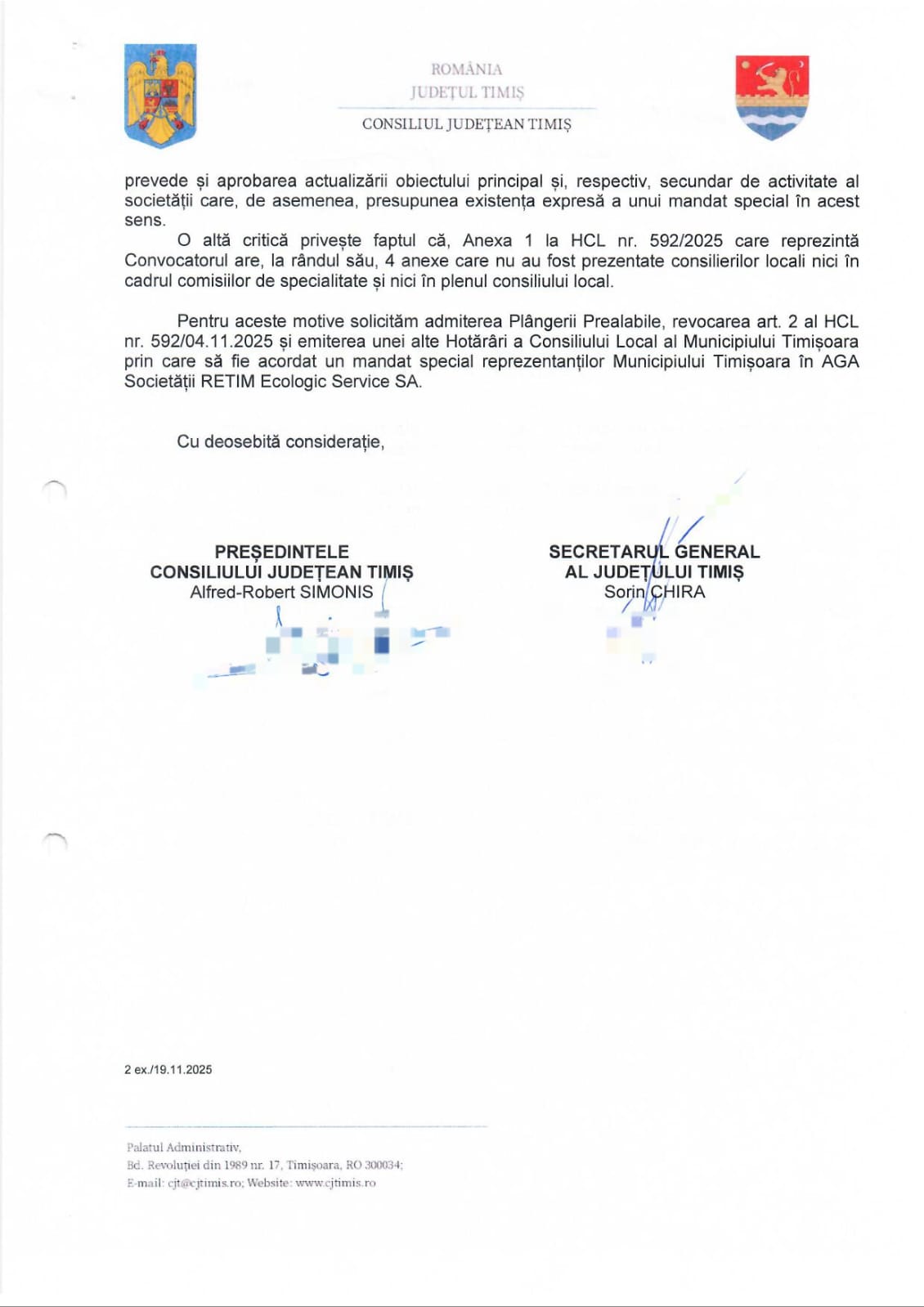 Pe de altă parte, instituția încearcă să acționeze și pe plan administrativ și ulterior juridic. Tot joi, reprezentanții CJT au anunțat că au transmis o plângere prealabilă către Consiliul Local Timișoara, având câteva acuzații referitoare la hotărârea care a stat la baza mutării sediului societății. Mai precis, Consiliul Județean Timiș contestă articolul 2 din HCL 592/2025, luată pe 4 noiembrie, prin care au fost mandatați reprezentanții municipiului în Adunarea Generală a Acționarilor RETIM Ecologic Service SA.