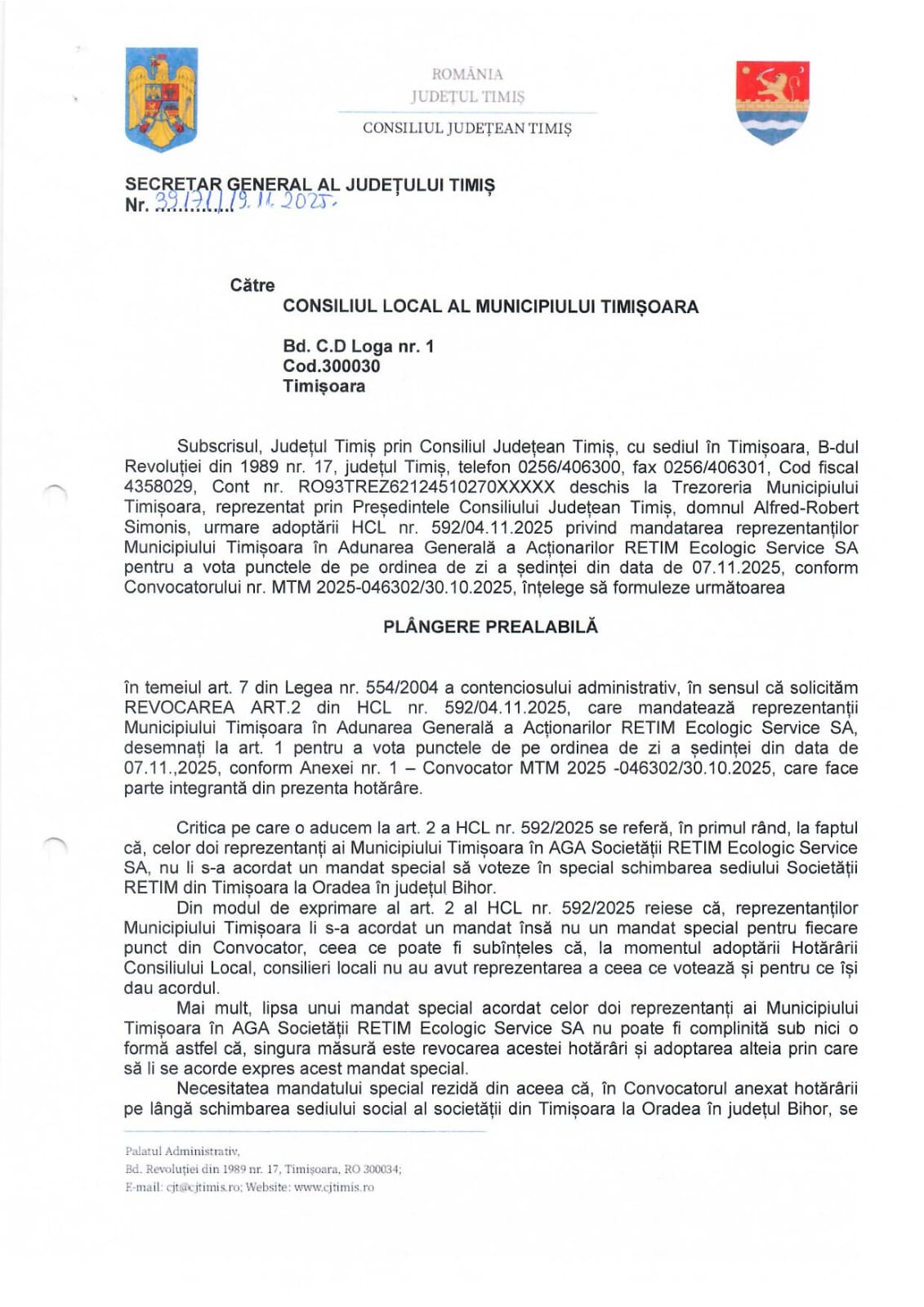 Pe de altă parte, instituția încearcă să acționeze și pe plan administrativ și ulterior juridic. Tot joi, reprezentanții CJT au anunțat că au transmis o plângere prealabilă către Consiliul Local Timișoara, având câteva acuzații referitoare la hotărârea care a stat la baza mutării sediului societății. Mai precis, Consiliul Județean Timiș contestă articolul 2 din HCL 592/2025, luată pe 4 noiembrie, prin care au fost mandatați reprezentanții municipiului în Adunarea Generală a Acționarilor RETIM Ecologic Service SA.