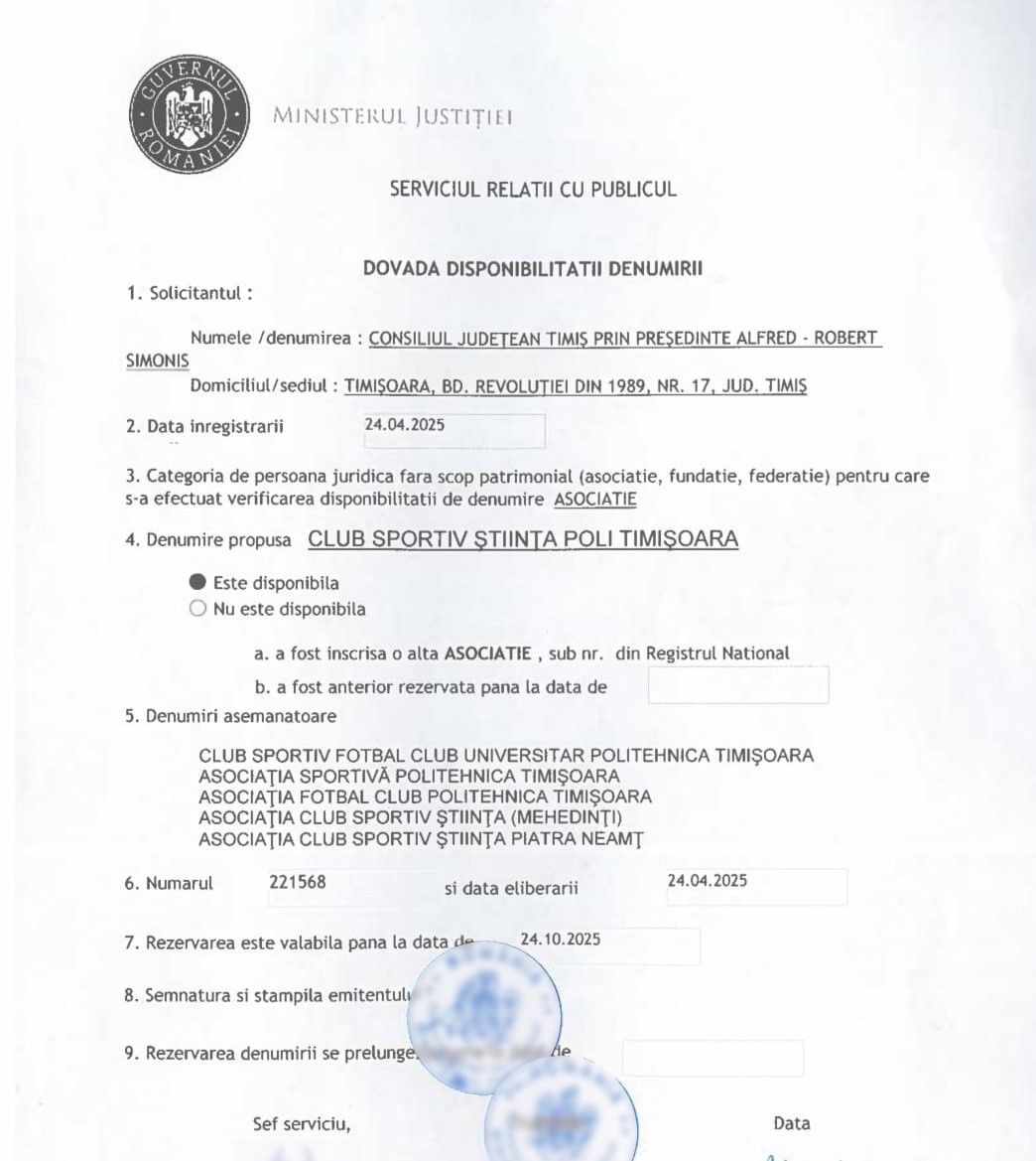 Cu stadionul aflat în stadiu de demolare, Alfred Simonis, președintele Consiliului Județean Timiș, a anunțat, marți, că noua echipă fanion a Banatului se va numi Club Sportiv Știința Poli Timișoara. Aceasta este denumirea pe care Ministerul Justiției a acceptat-o, iar săptămâna viitoare reprezentanții Consiliului Județean Timiș și ai Universității Politehnica vor depune la Tribunalul Timiș documentele necesare înființării clubului.