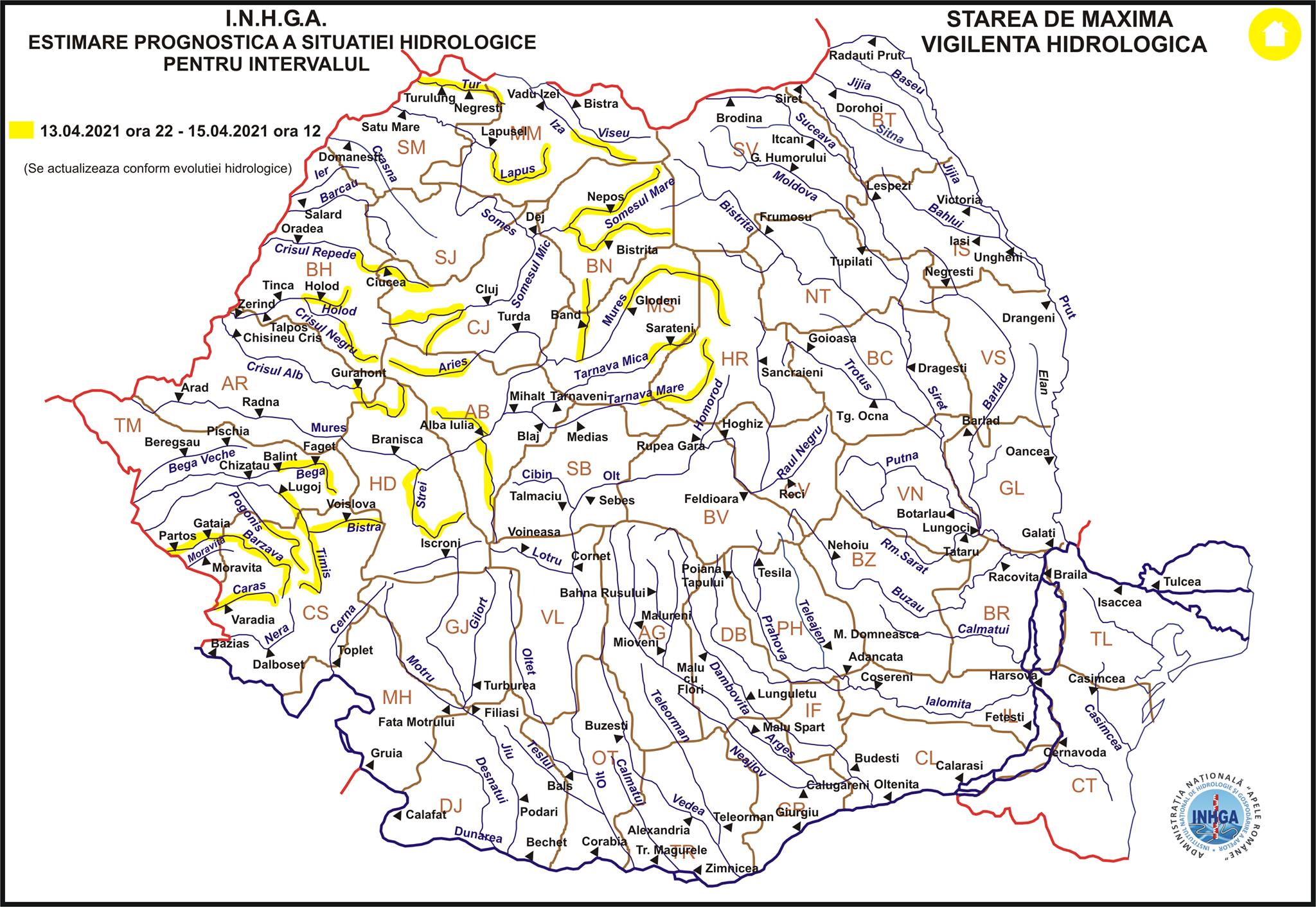 Atenționarea hidrologică va intra în vigoare marți seară, de la ora 22, și va fi valabilă până joi, 15 aprilie, la ora 12. Specialiștii anunță că vor fi înregistrate creșteri de debite și niveluri cu depășirea cotelor de apărare.