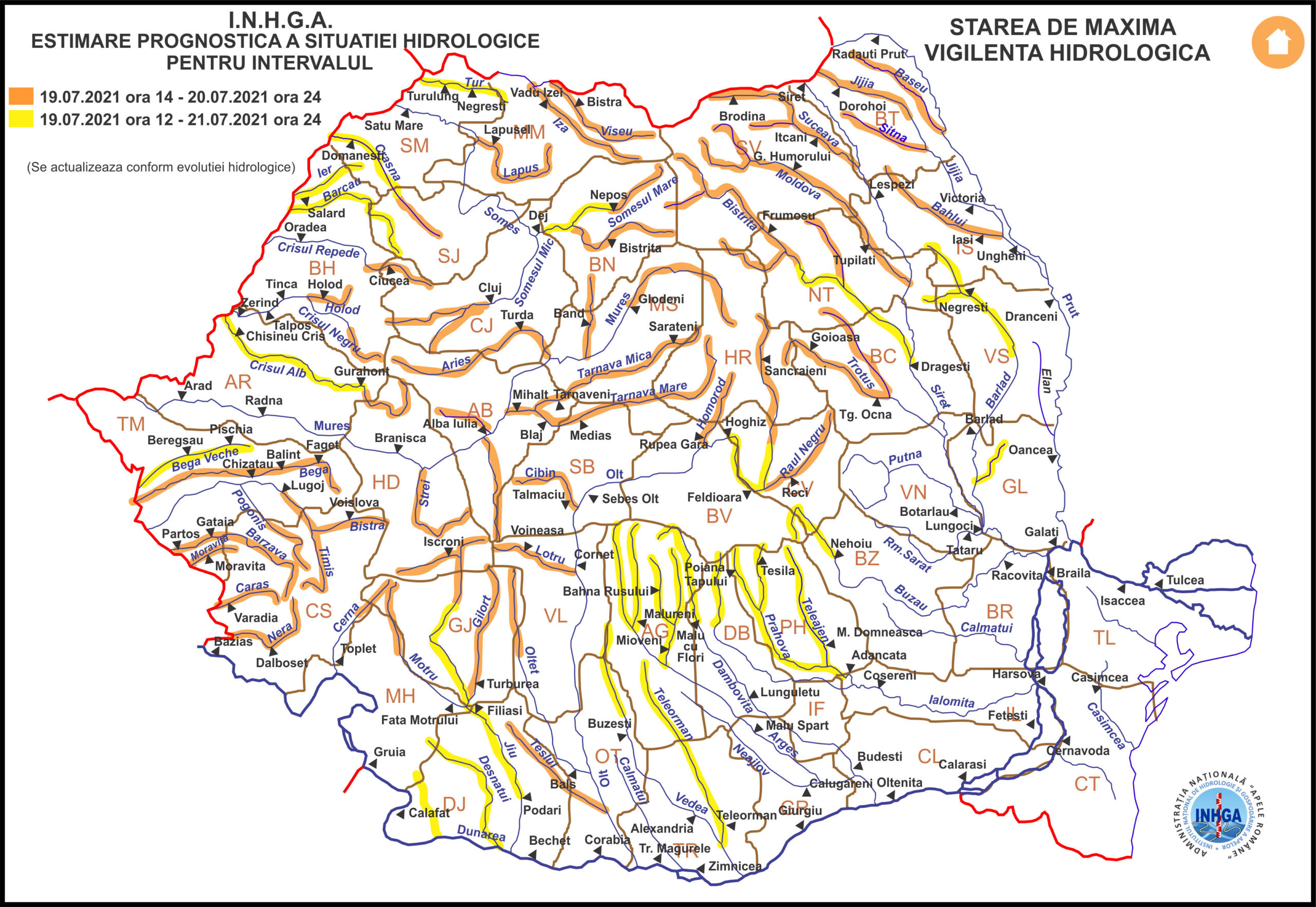 Codul galben a intrat în vigoare de luni, 19 iulie, de la ora 12, și este valabil până pe 21 iulie, ora 24 și vizează Bega Veche, Bega (judeţul Timiş), Timiş – bazin amonte S.H. Lugoj şi afluenţii aferenţi sectorului aval S.H. Lugoj, Bârzava, Moraviţa, Caraş, Nera (judeţele: Timiş şi Caraş-Severin), Cerna – bazin superior şi afluenţi bazin mijlociu şi inferior (judeţele: Gorj şi Caraş-Severin), afluenţii mici ai Dunării aferenţi sectorului amonte S.H. Gruia (judeţele: Caraş-Severin şi Mehedinţi).